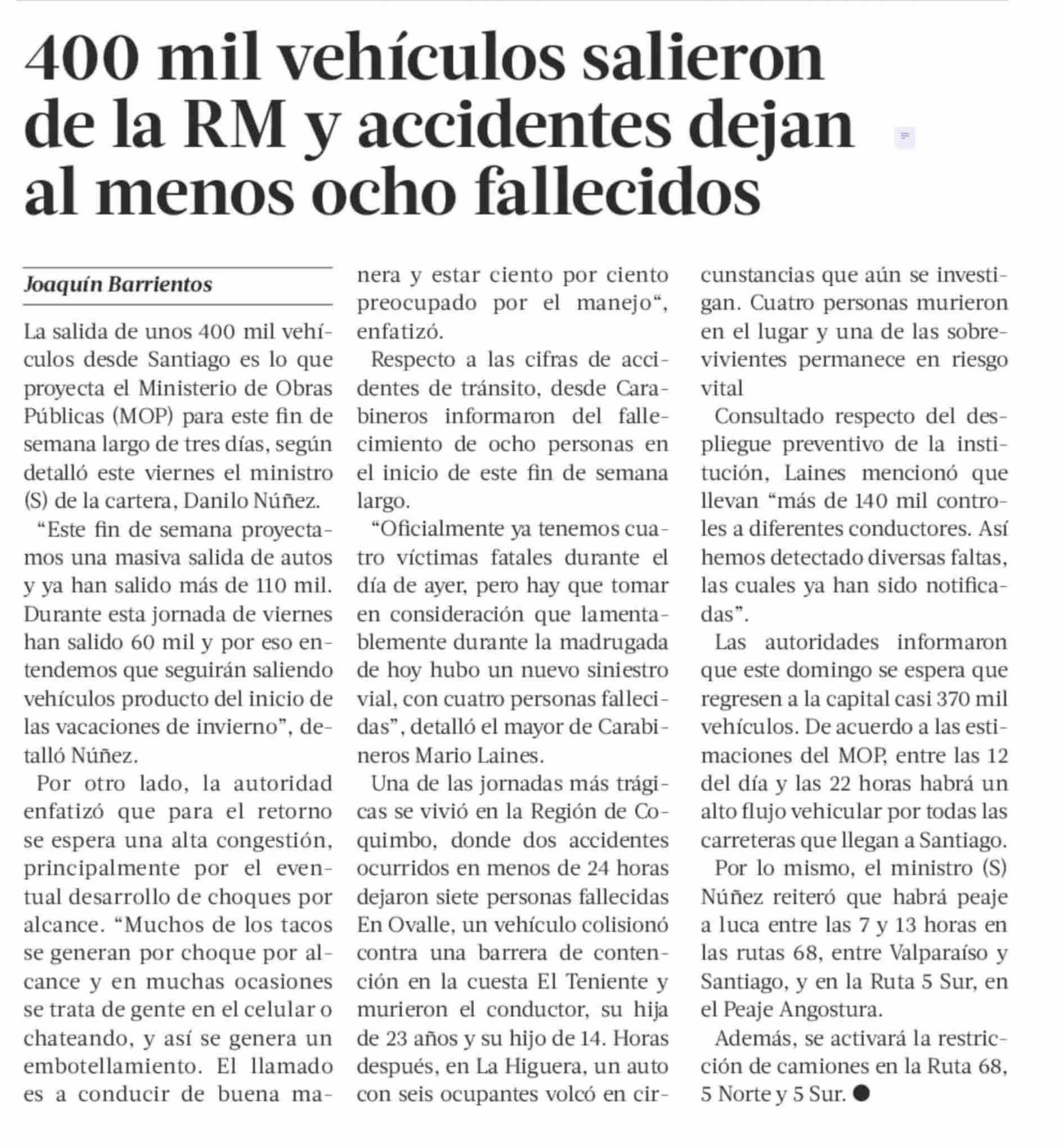 400 mil vehículos salieron de la RM y accidentes dejan al menos ocho fallecidos 21-06-2025 La Tercera |