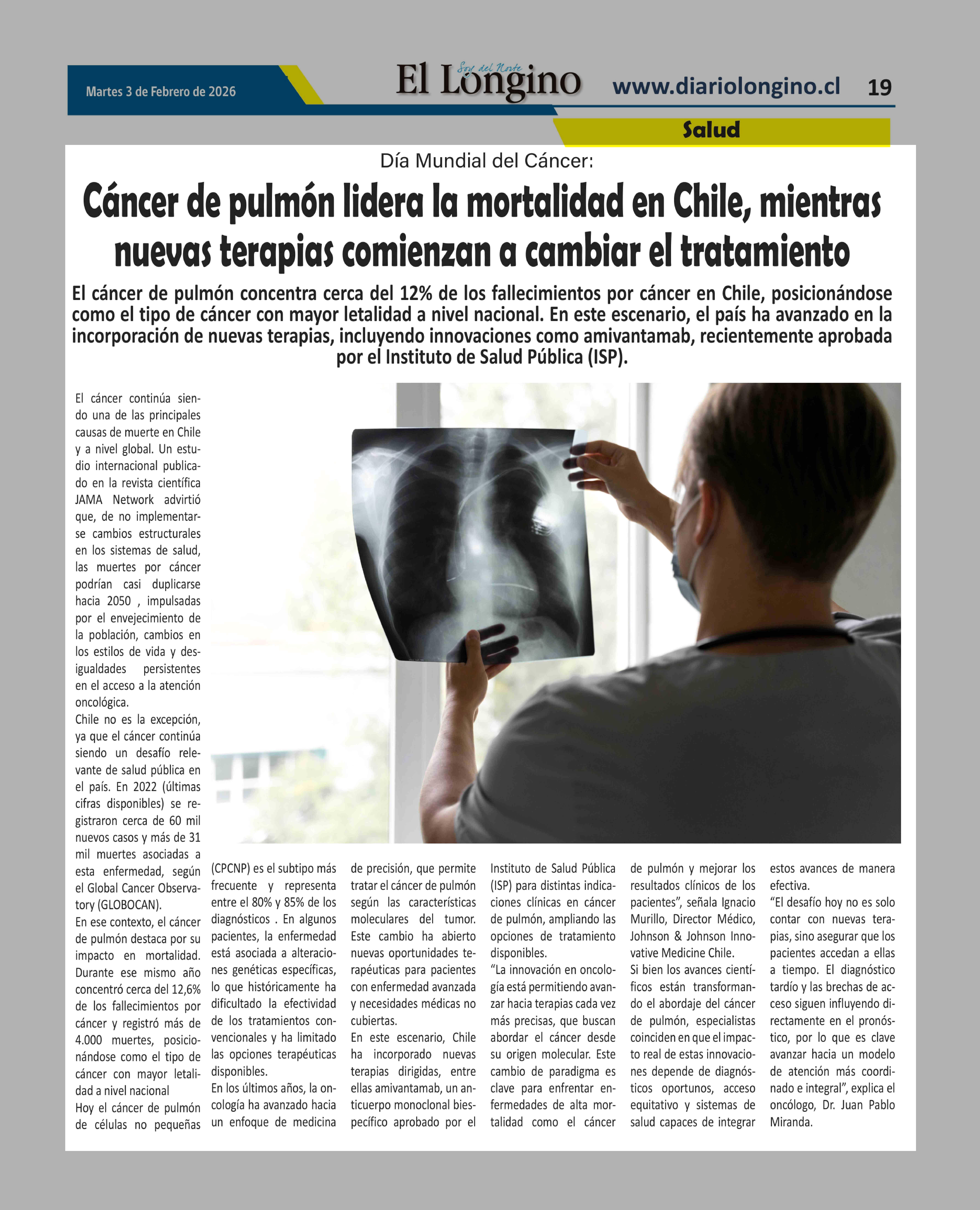Cáncer de pulmón lidera la mortalidad en Chile, mientras nuevas terapias comienzan a cambiar el tratamiento 03-02-2026 El Longino |