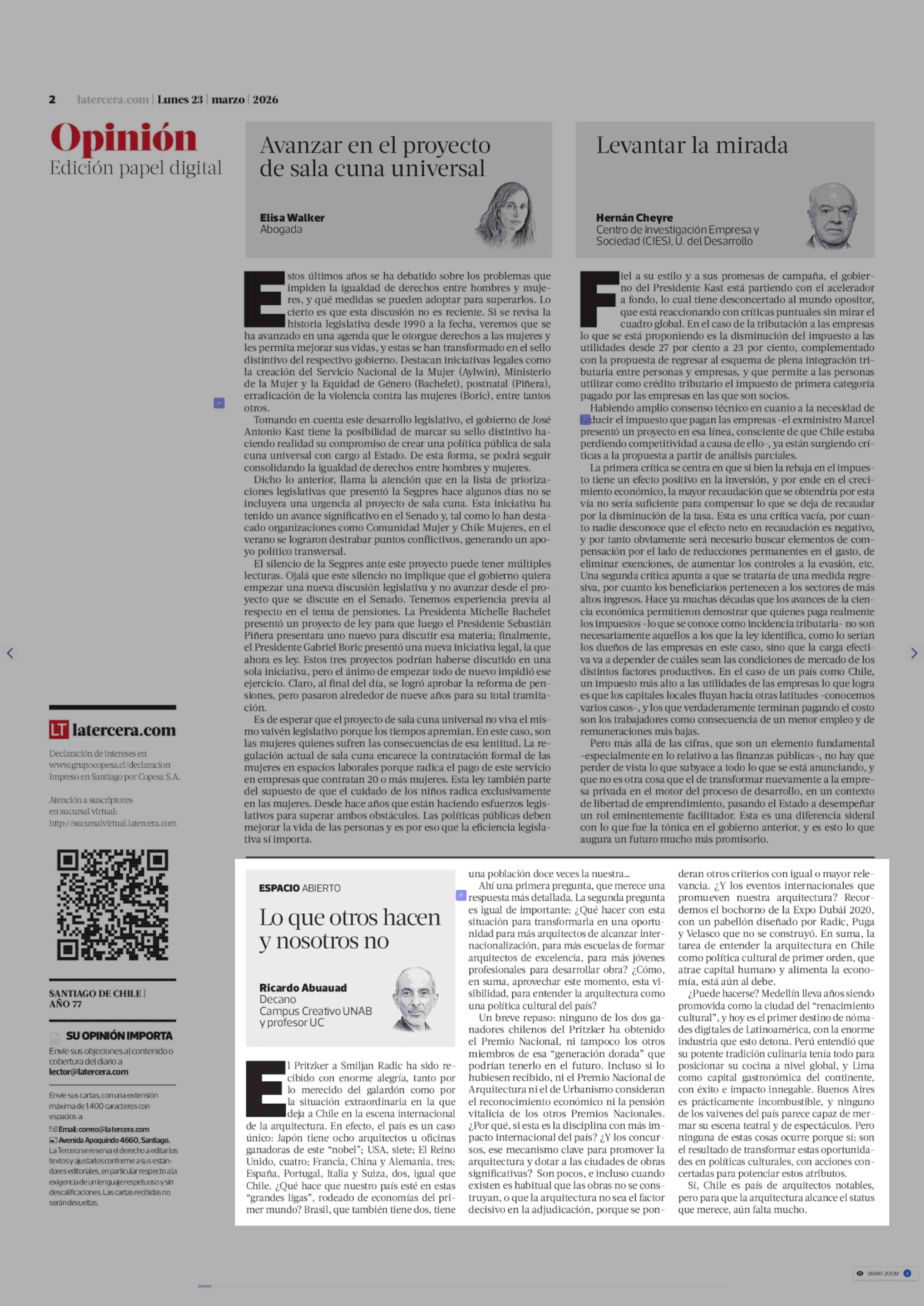 Columnas de Opinión: Lo que otros hacen y nosotros no 23-03-2026 La Tercera |