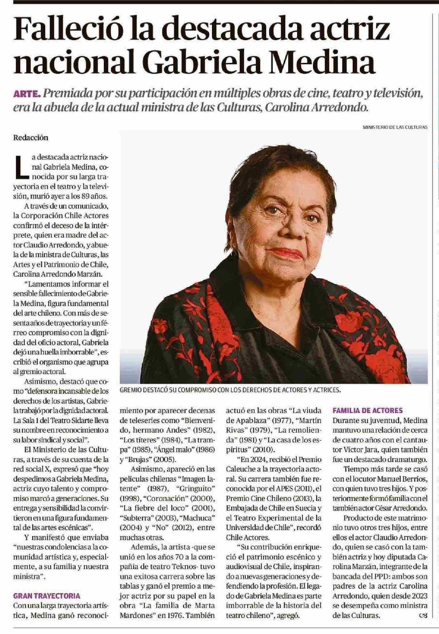 Falleció la destacada actriz nacional Gabriela Medina 17-06-2025 El Mercurio de Valparaíso |