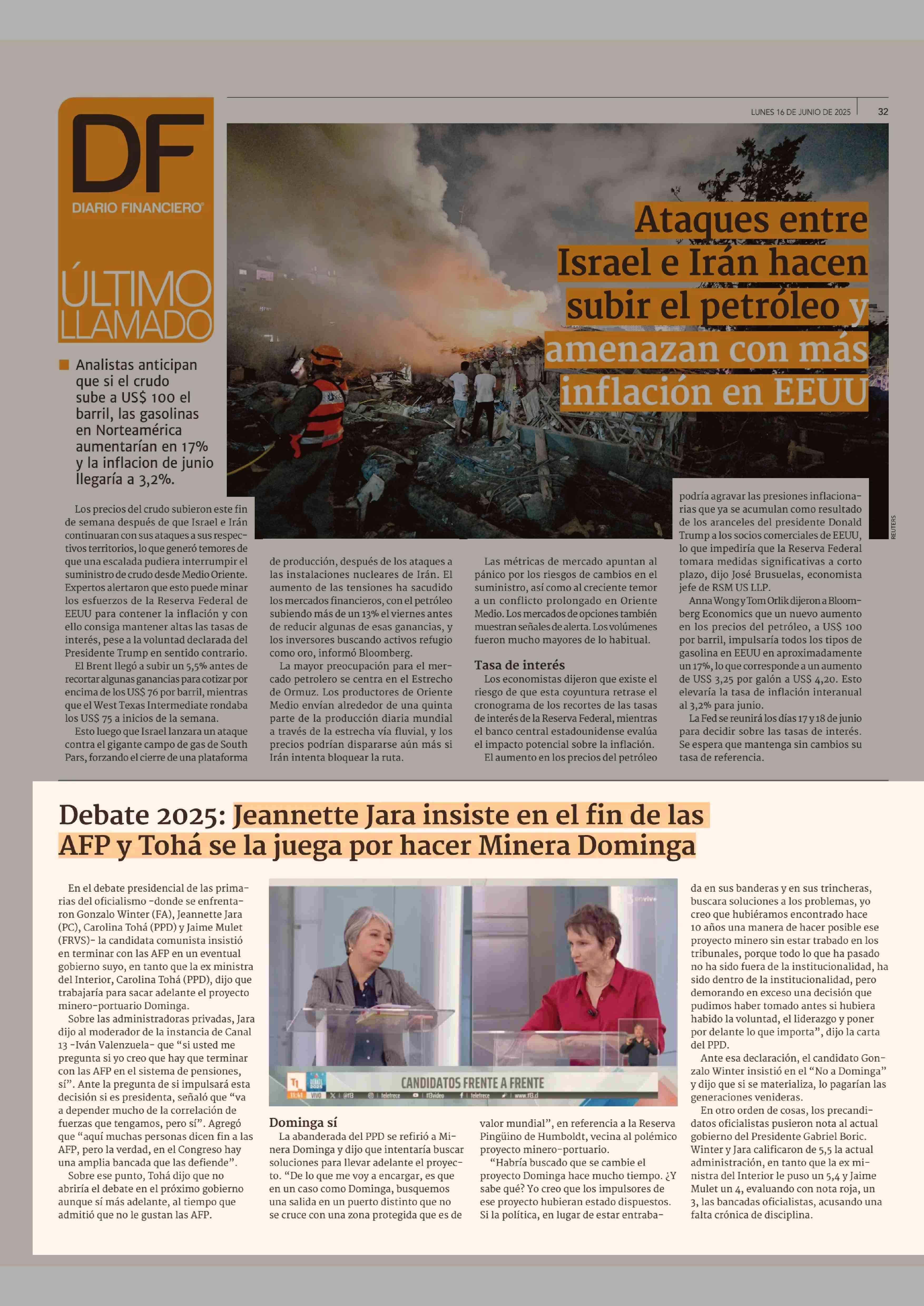 Debate 2025: Jeannette Jara insiste en el fin de las AFP y Tohá se la juega por hacer Minera Dominga 16-06-2025 Diario Financiero |
