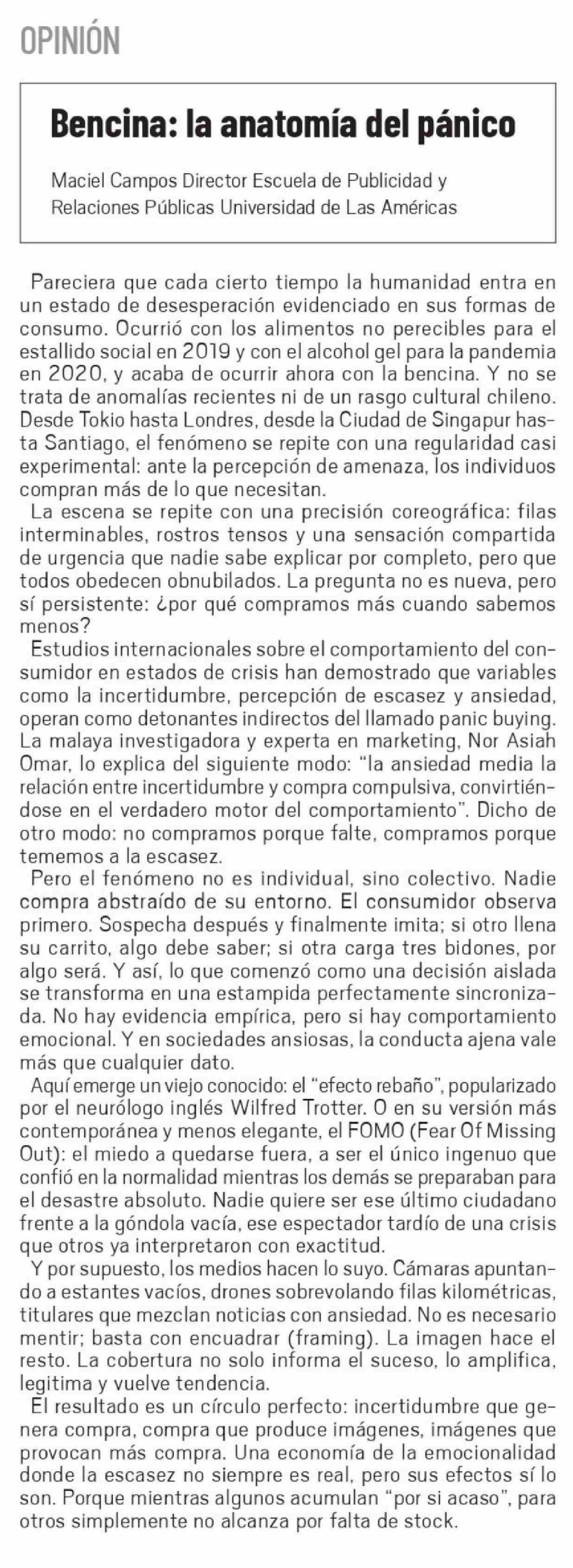 | Título: | Columnas de Opinión: Bencina: la anatomía del pánico |