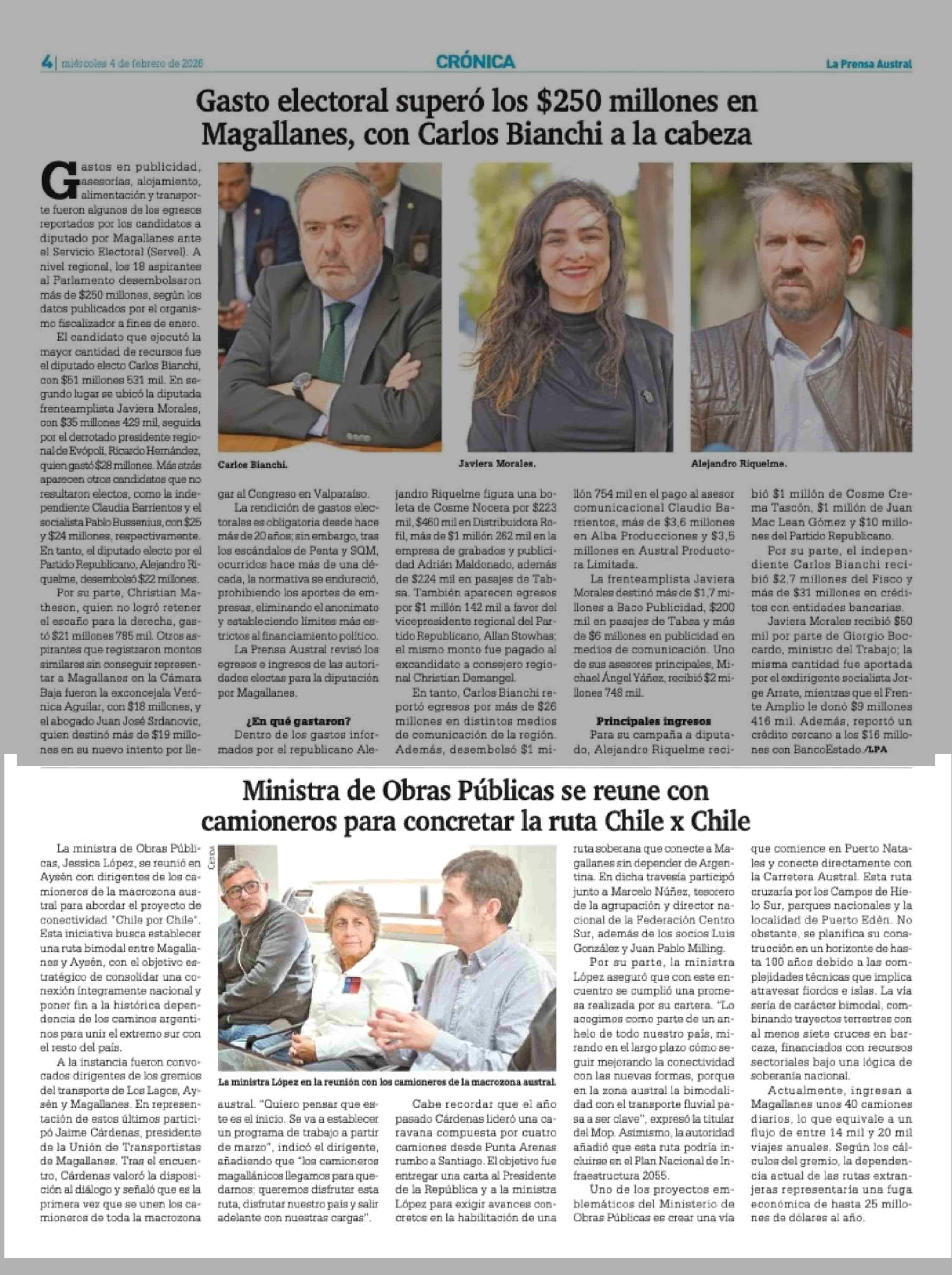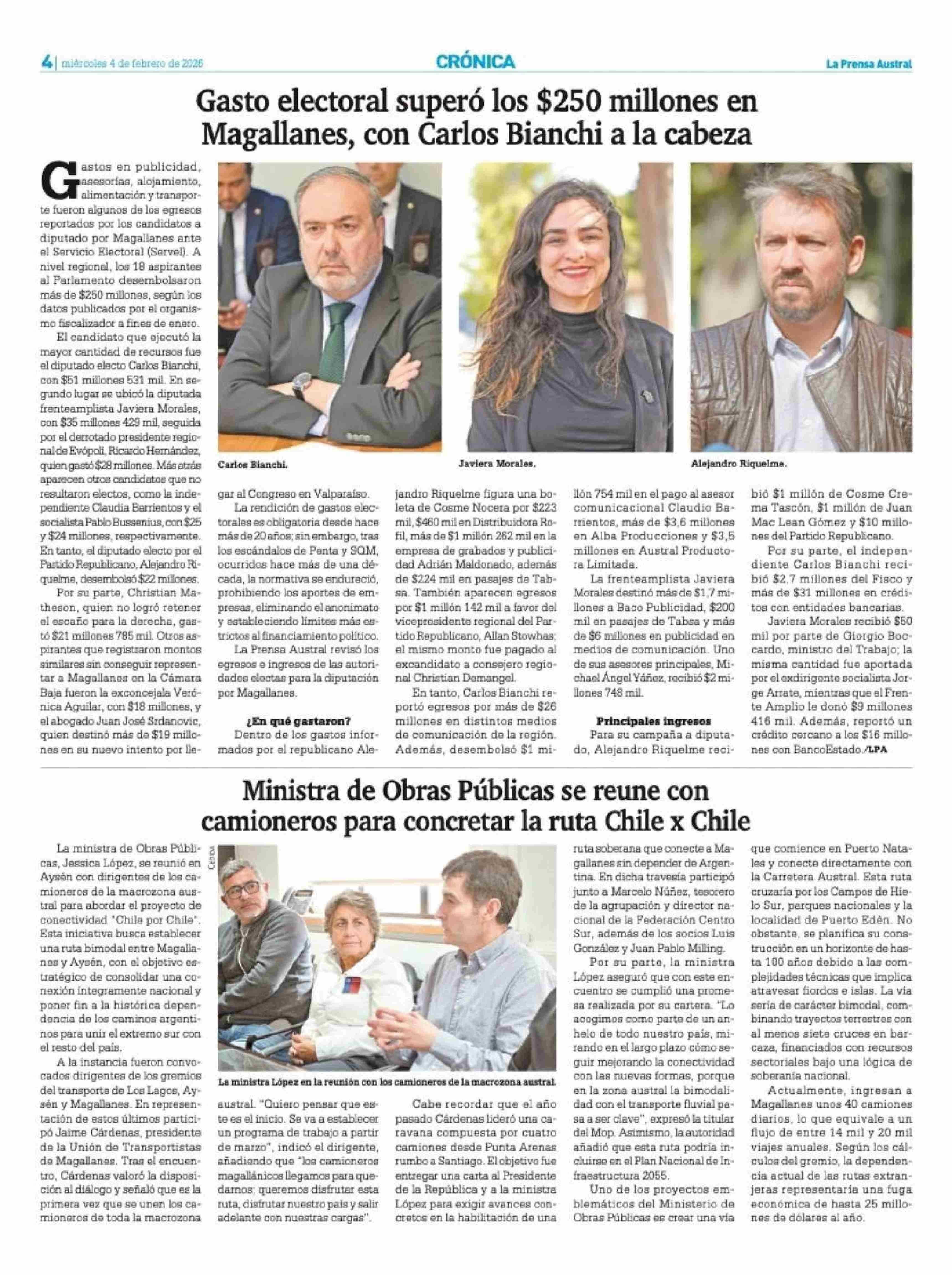 Ministra de Obras Públicas se reune con camioneros para concretar la ruta Chile x Chile 04-02-2026 La Prensa Austral |