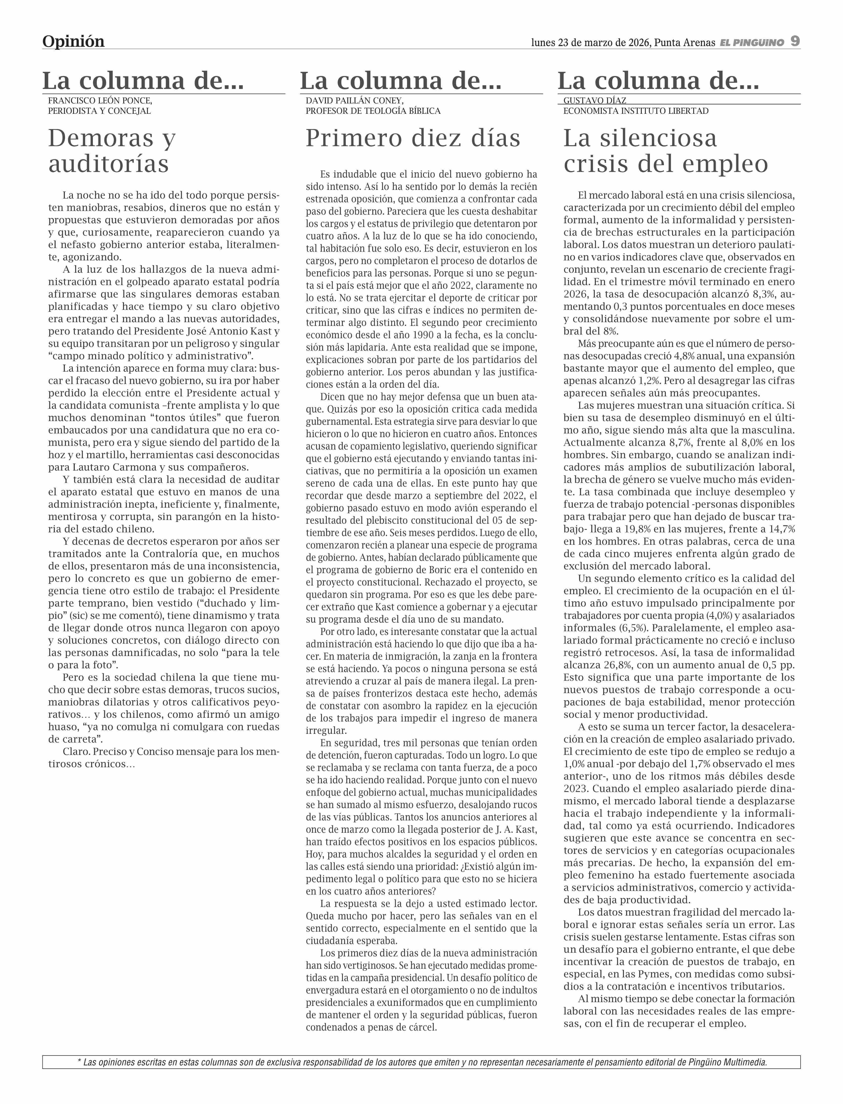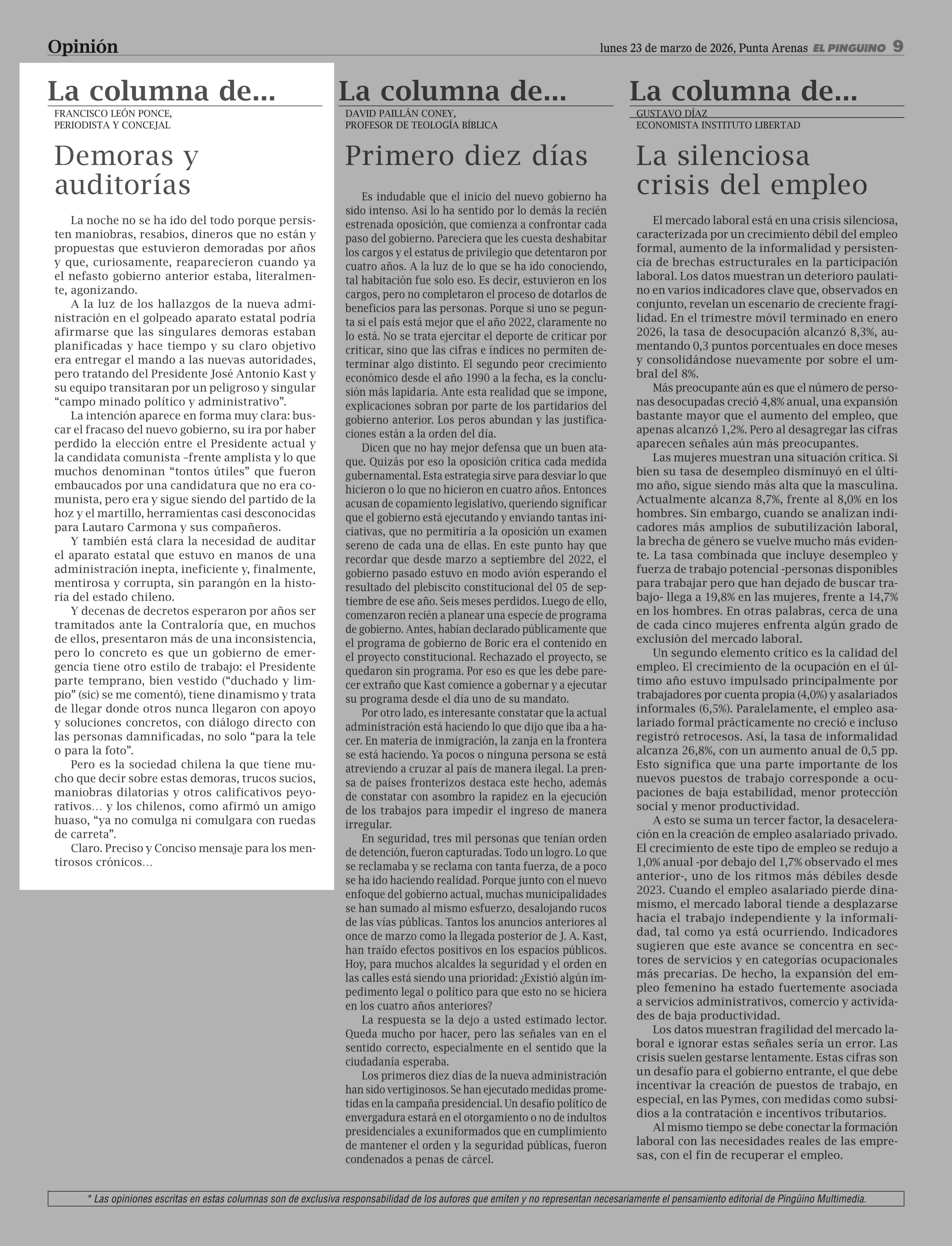 COLUMNAS DE OPINIÓN: Demoras y auditorías 23-03-2026 El Pingüino |