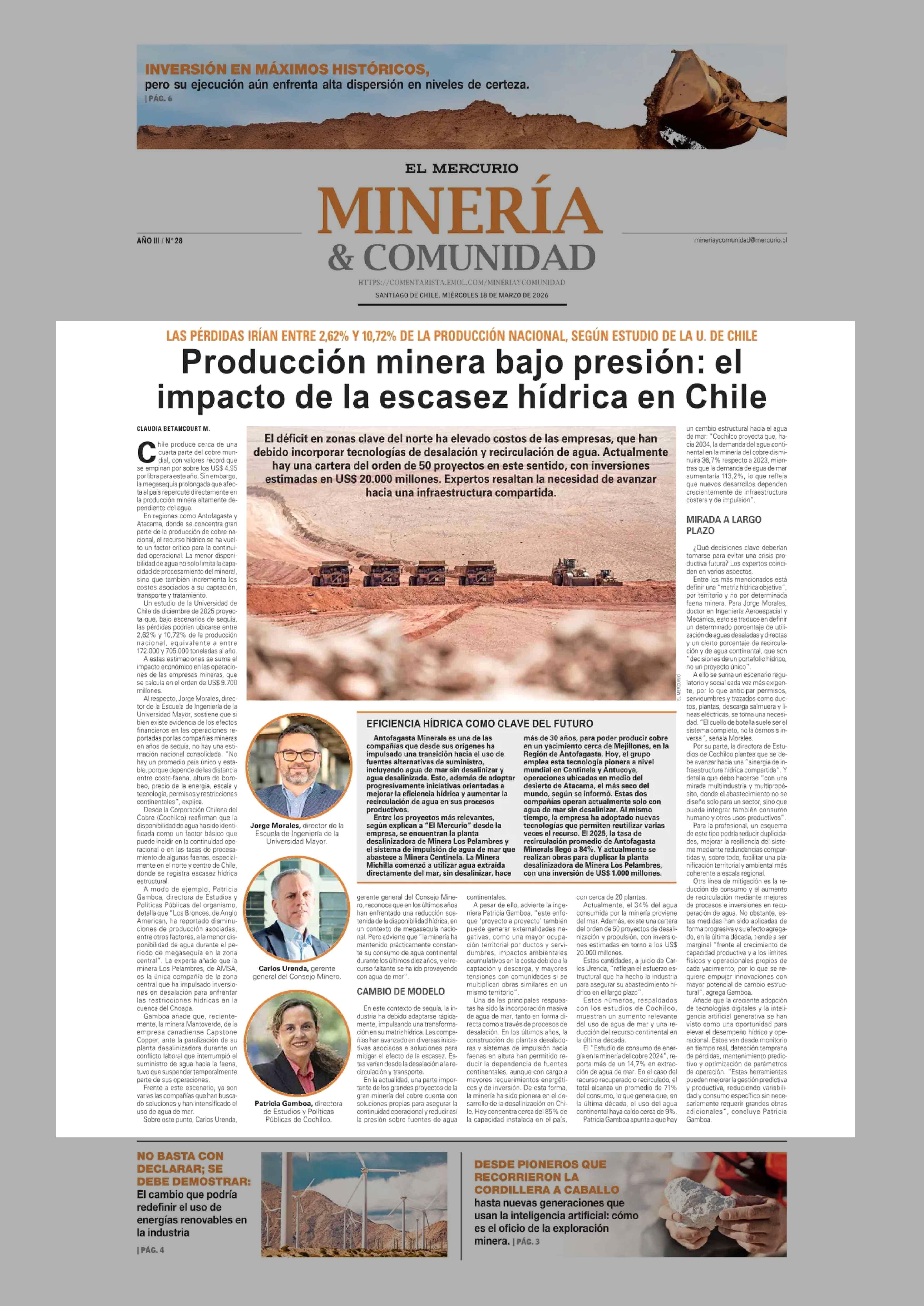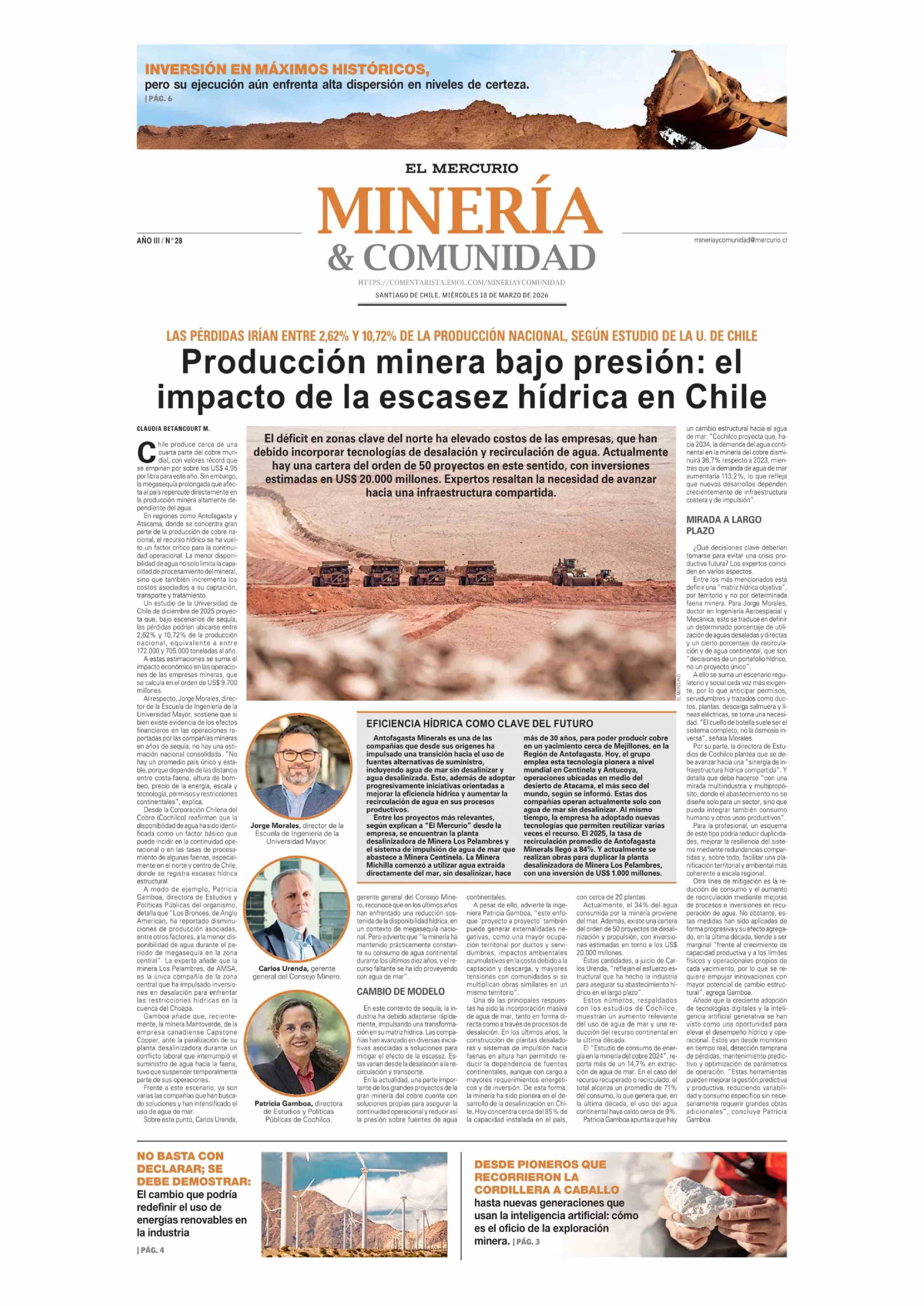 Producción minera bajo presión: el impacto de la escasez hídrica en Chile 18-03-2026 El Mercurio |