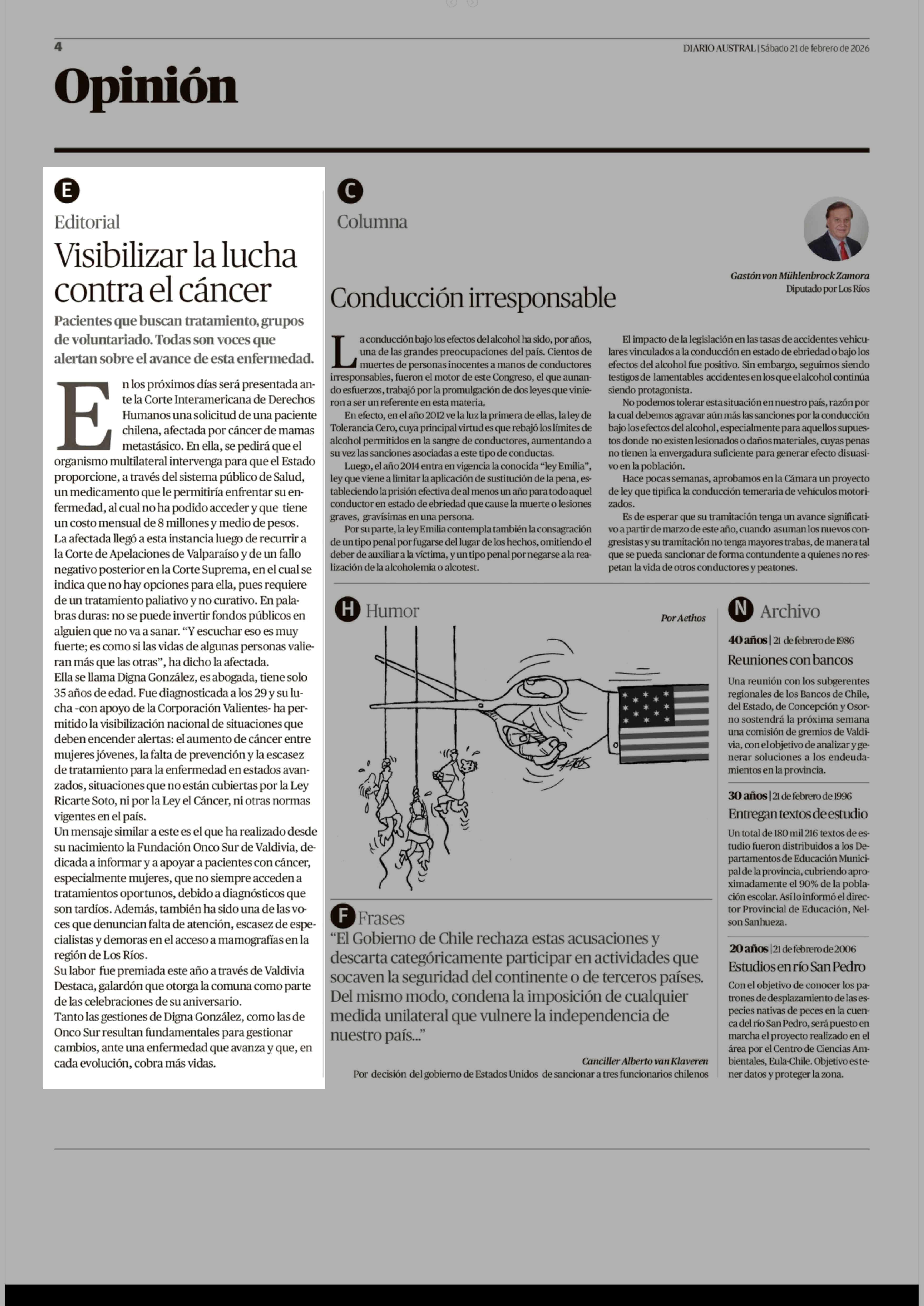 Editorial: Visibilizar la lucha contra el cáncer 21-02-2026 Diario Austral Región de Los Ríos |