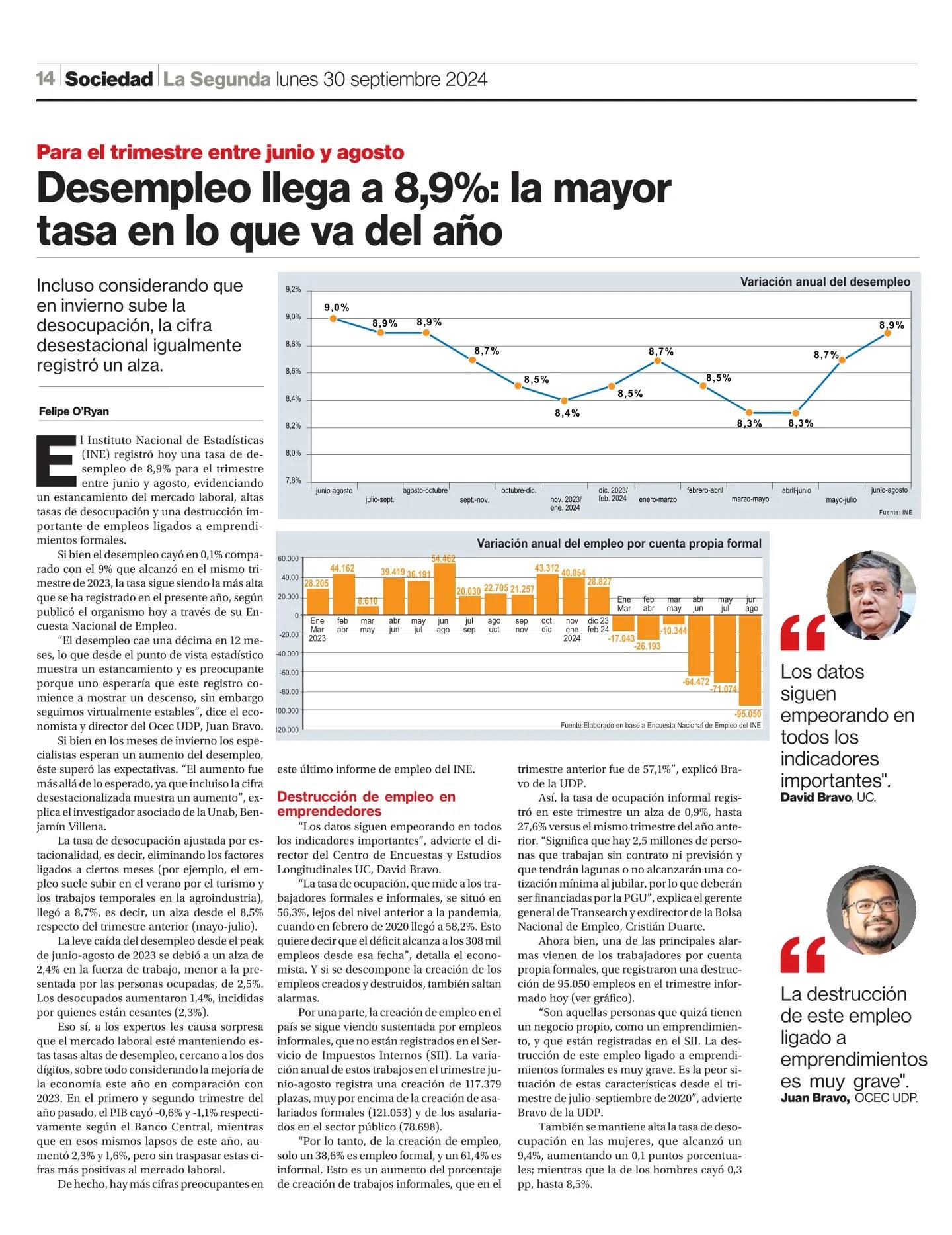 Desempleo llega a 8, 9%: la mayor tasa en lo que va del año 30-09-2024 La Segunda |