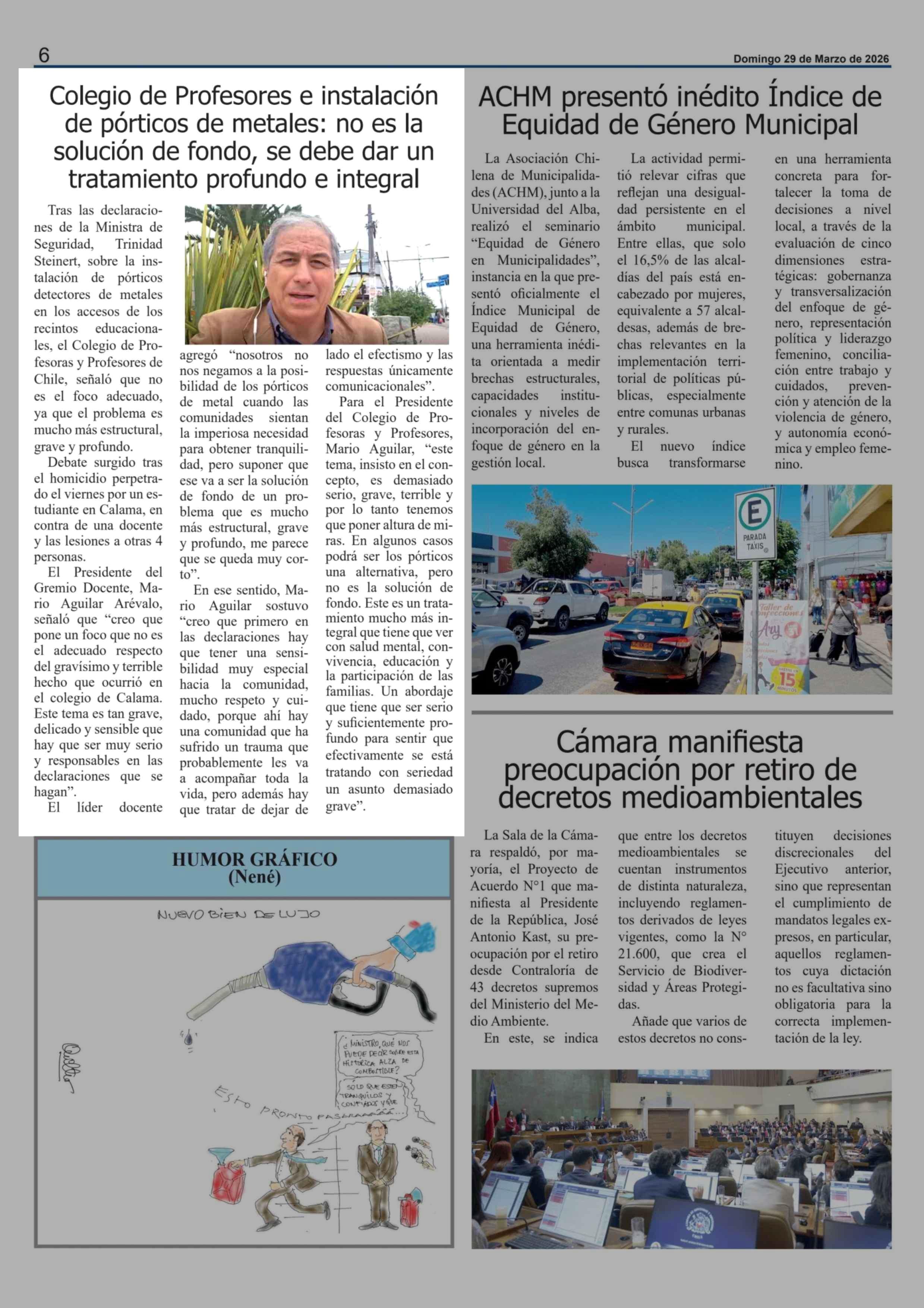 Colegio de Profesores e instalación de pórticos de metales: no es la solución de fondo, se debe dar un tratamiento profundo e integral 29-03-2026 El Heraldo |