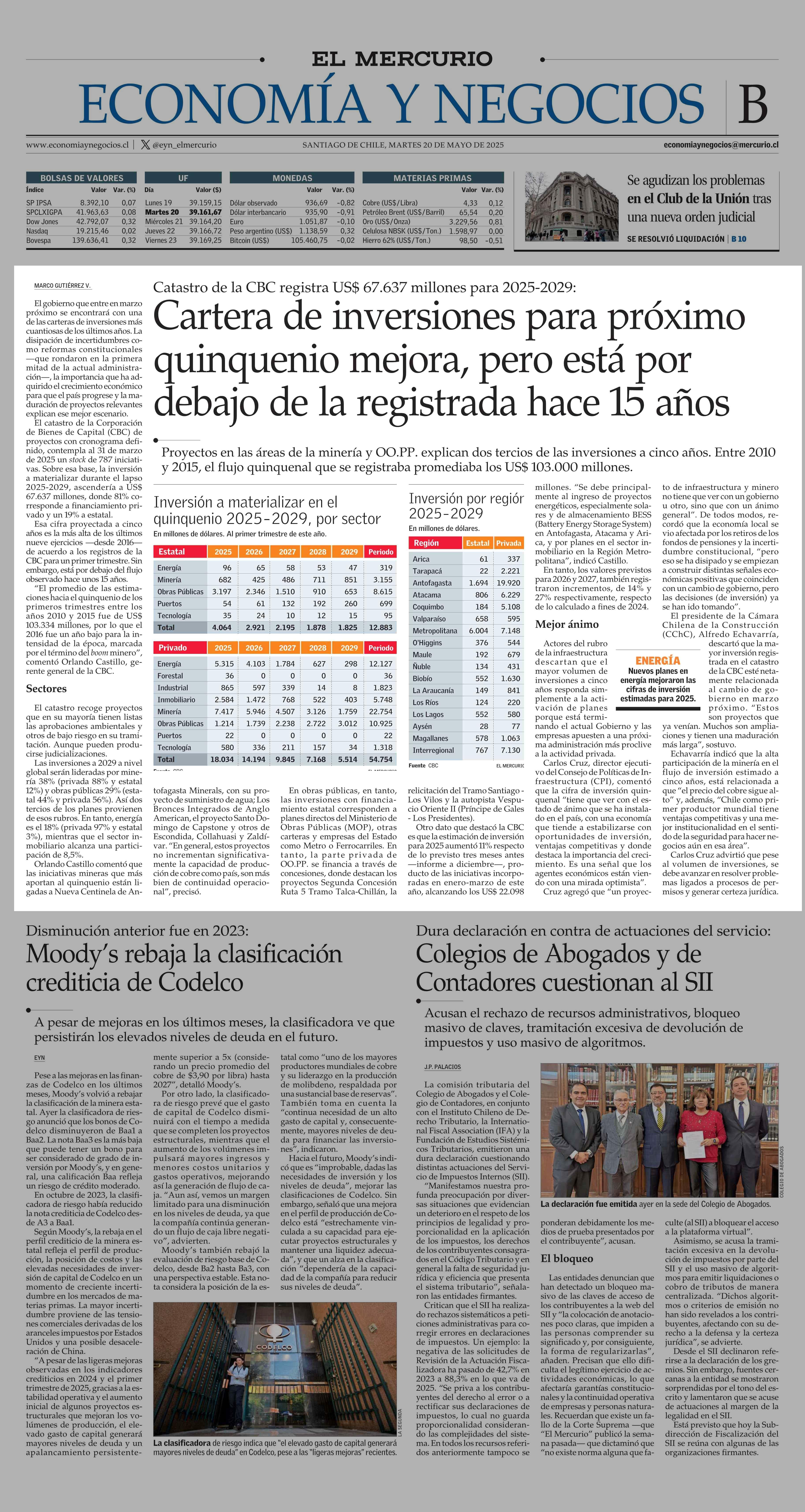 Cartera de inversiones para próximo quinquenio mejora, pero está por debajo de la registrada hace 15 años 20-05-2025 El Mercurio |