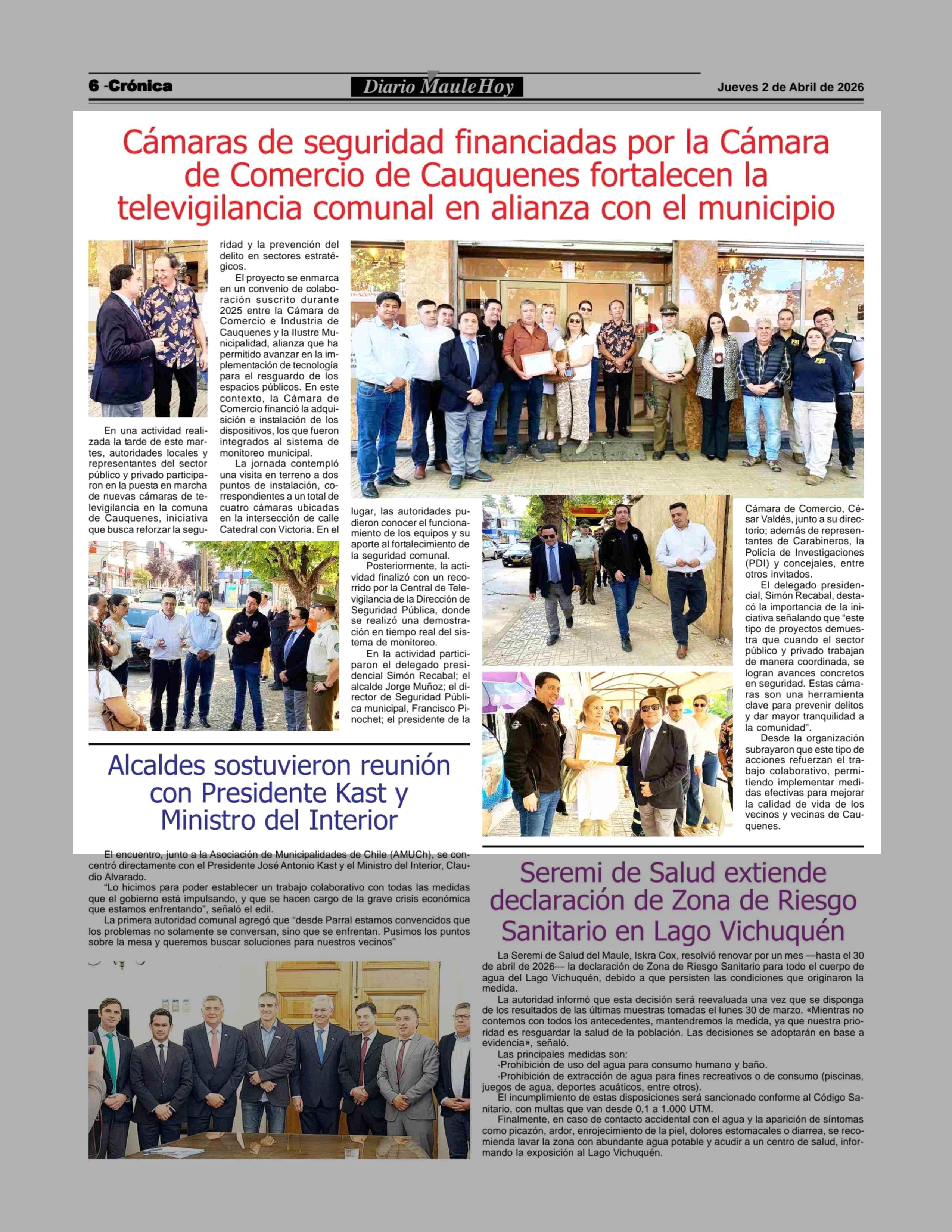 Cámaras de seguridad financiadas por la Cámara de Comercio de Cauquenes fortalecen la televigilancia comunal en alianza con el municipio 02-04-2026 Maule Hoy |