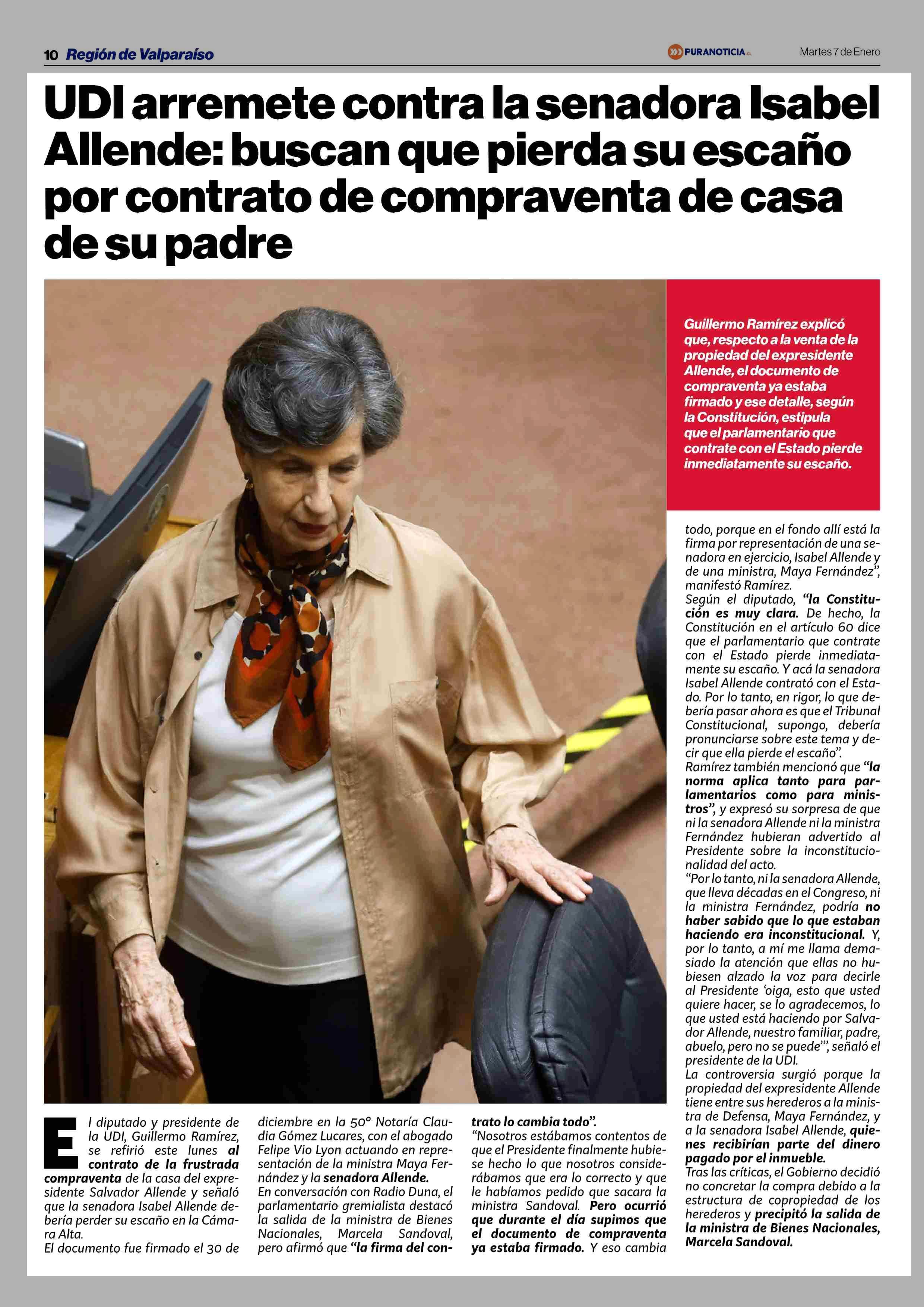 UDI arremete contra la senadora Isabel Allende: buscan que pierda su escaño por contrato de compraventa de casa de su padre 07-01-2025 Puranoticia.cl |
