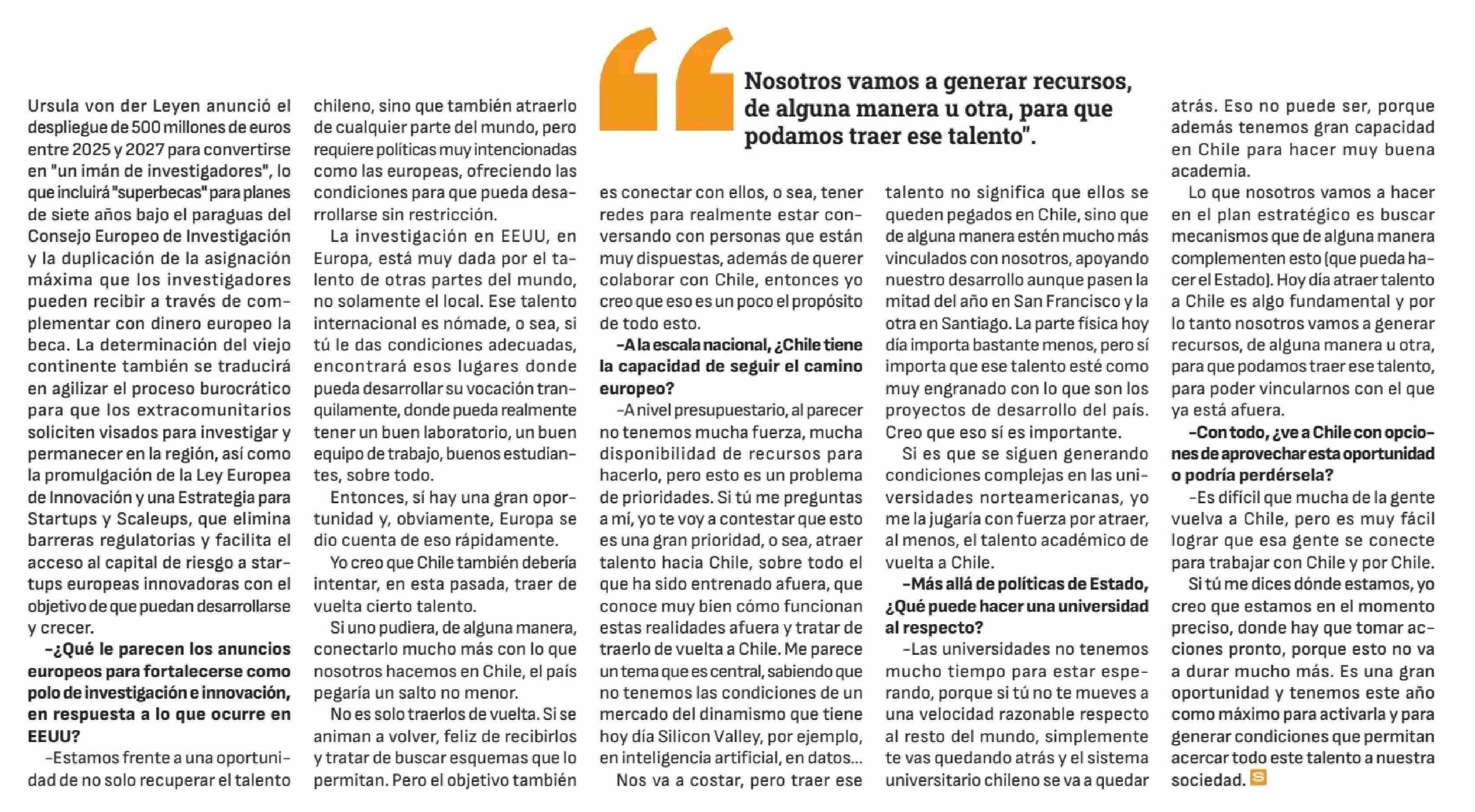 | Título: | Juan Carlos de la Llera, rector de la PUC: “Estamos frente a una oportunidad no solo de recuperar el talento chileno, sino que también de atraerlo de cualquier parte del mundo” |