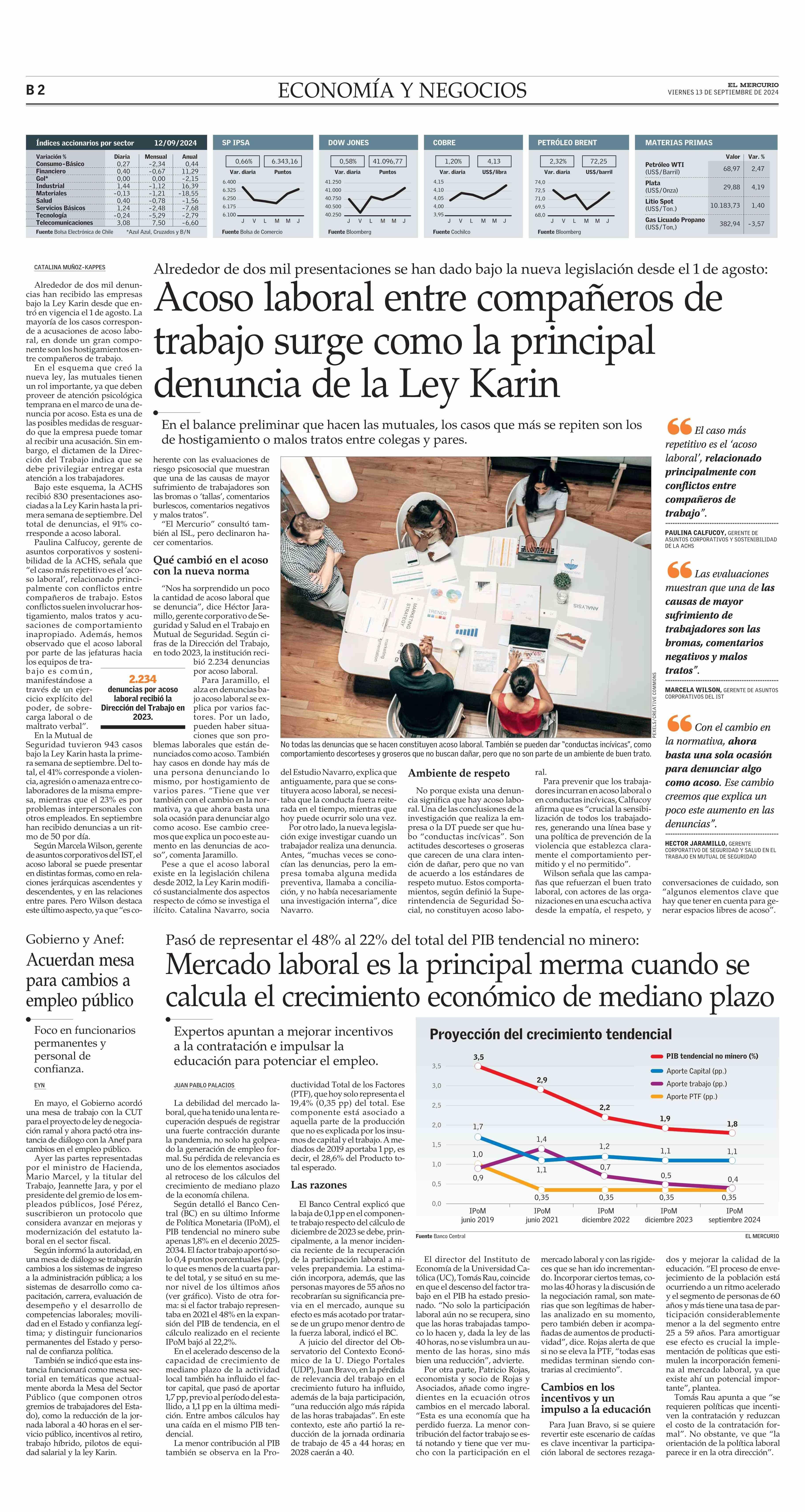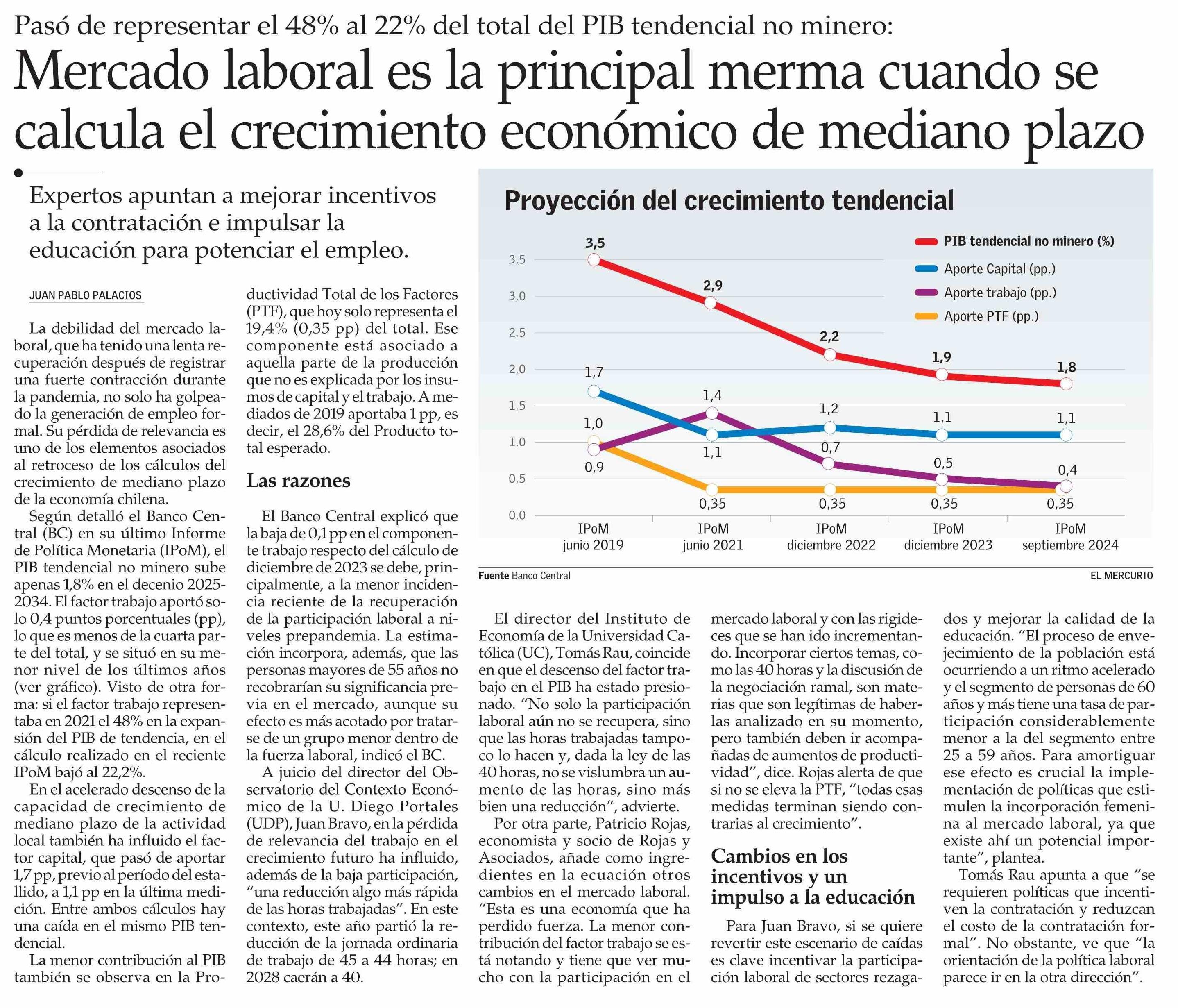 Mercado laboral es la principal merma cuando se calcula el crecimiento económico de mediano plazo 13-09-2024 El Mercurio |