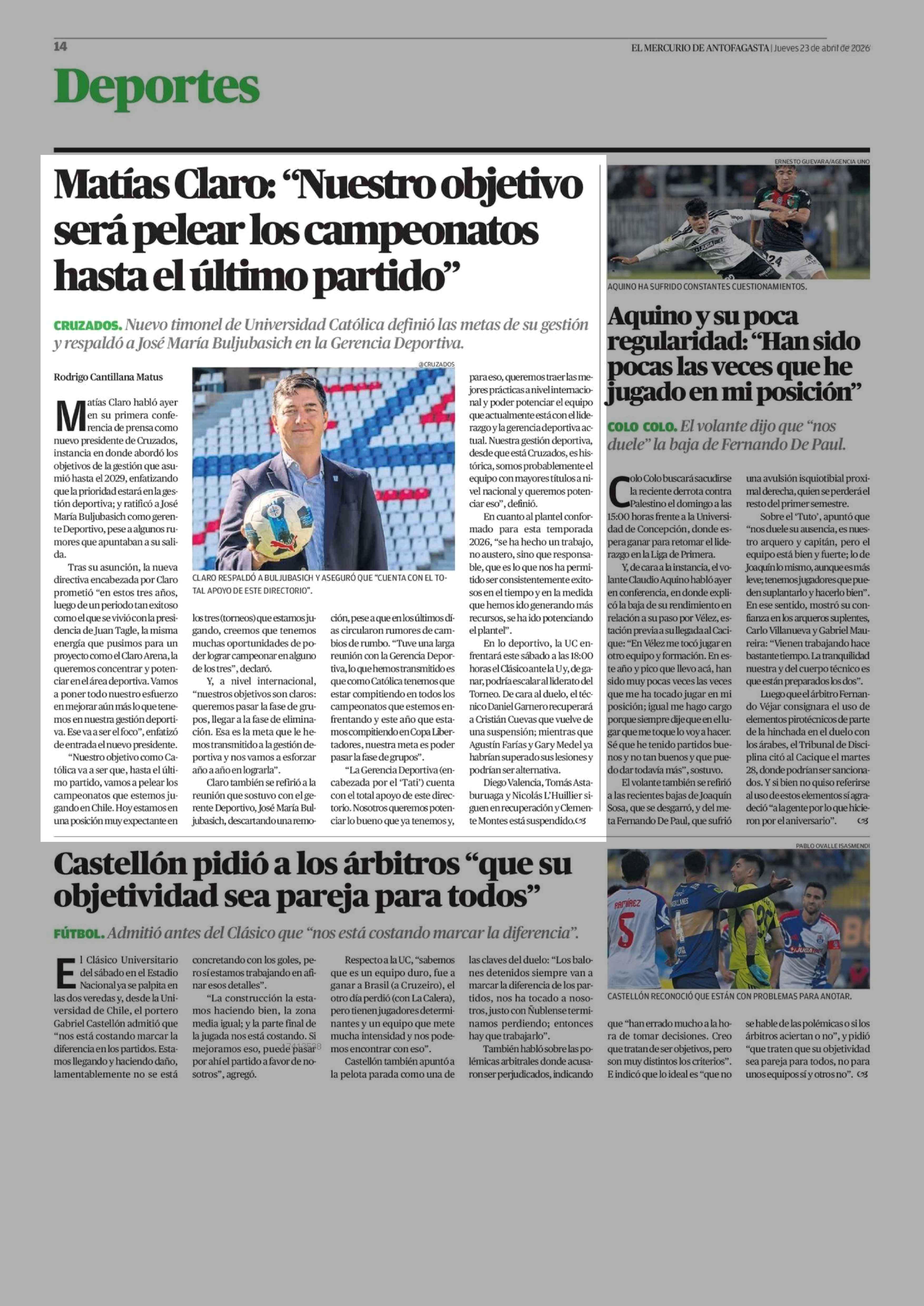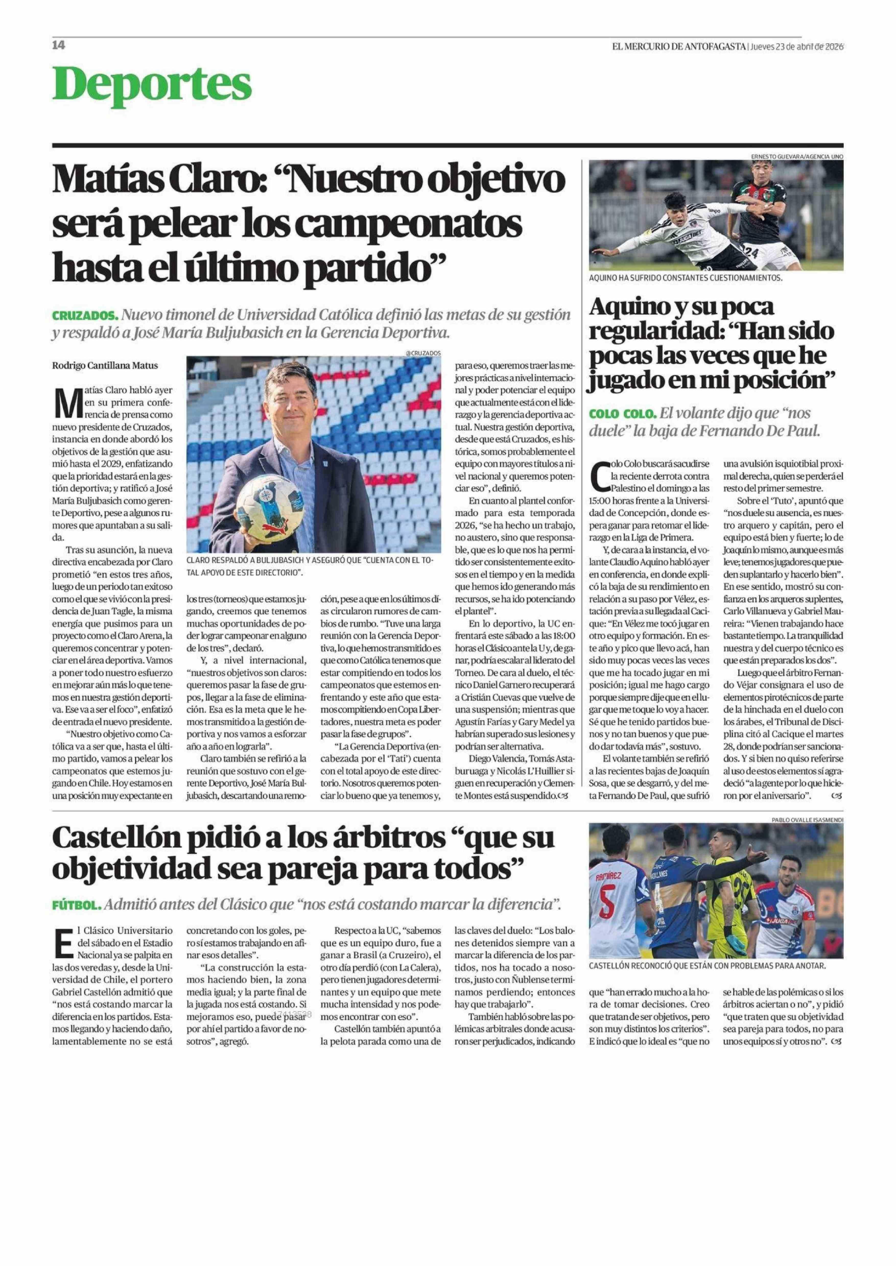 Matías Claro: "Nuestro objetivo será pelear los campeonatos hasta el último partido" 23-04-2026 El Mercurio de Antofagasta |