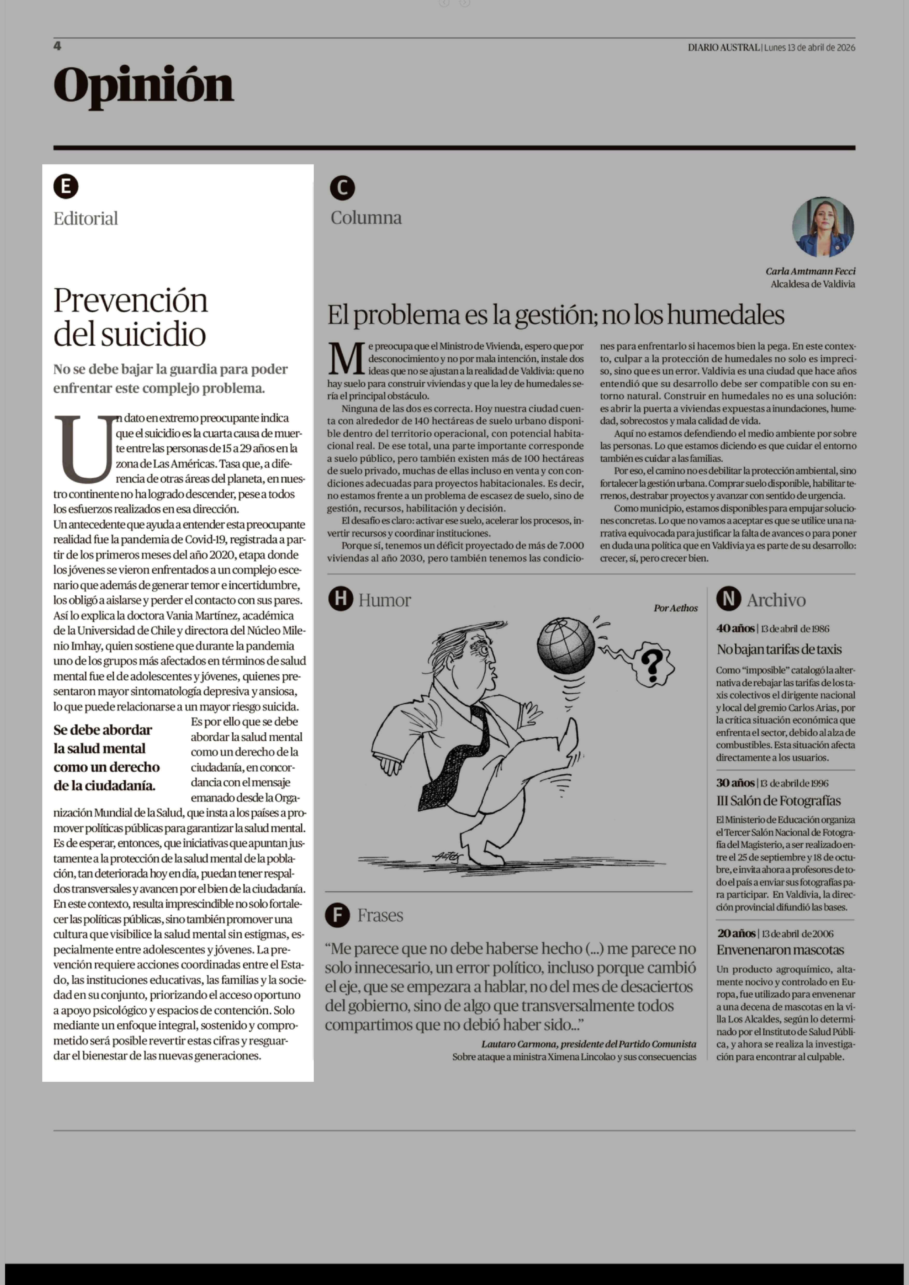Editorial: Prevención del suicidio 13-04-2026 Diario Austral Región de Los Ríos |