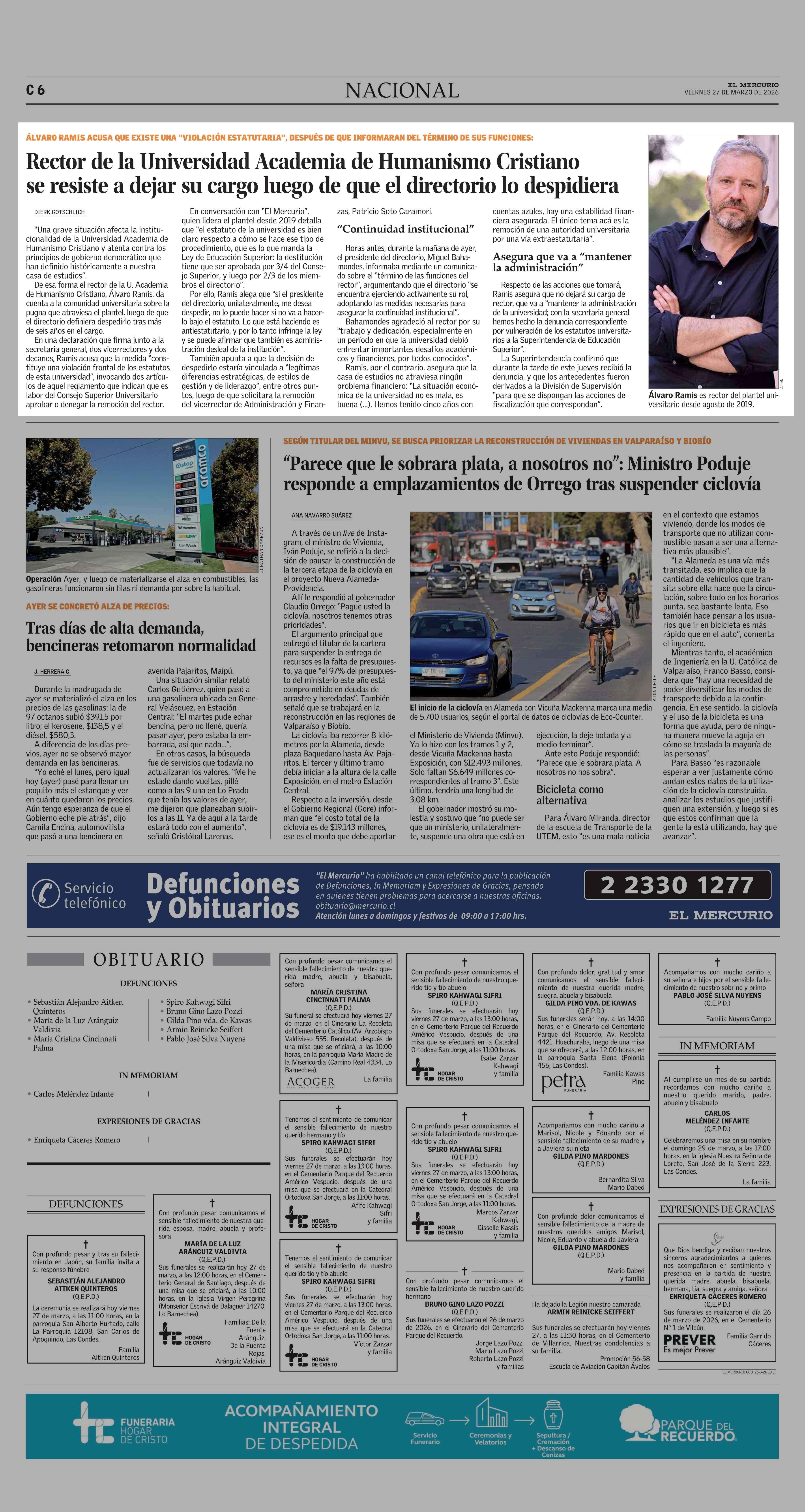 Rector de la Universidad Academia de Humanismo Cristiano se resiste a dejar su cargo luego de que el directorio lo despidiera 27-03-2026 El Mercurio |