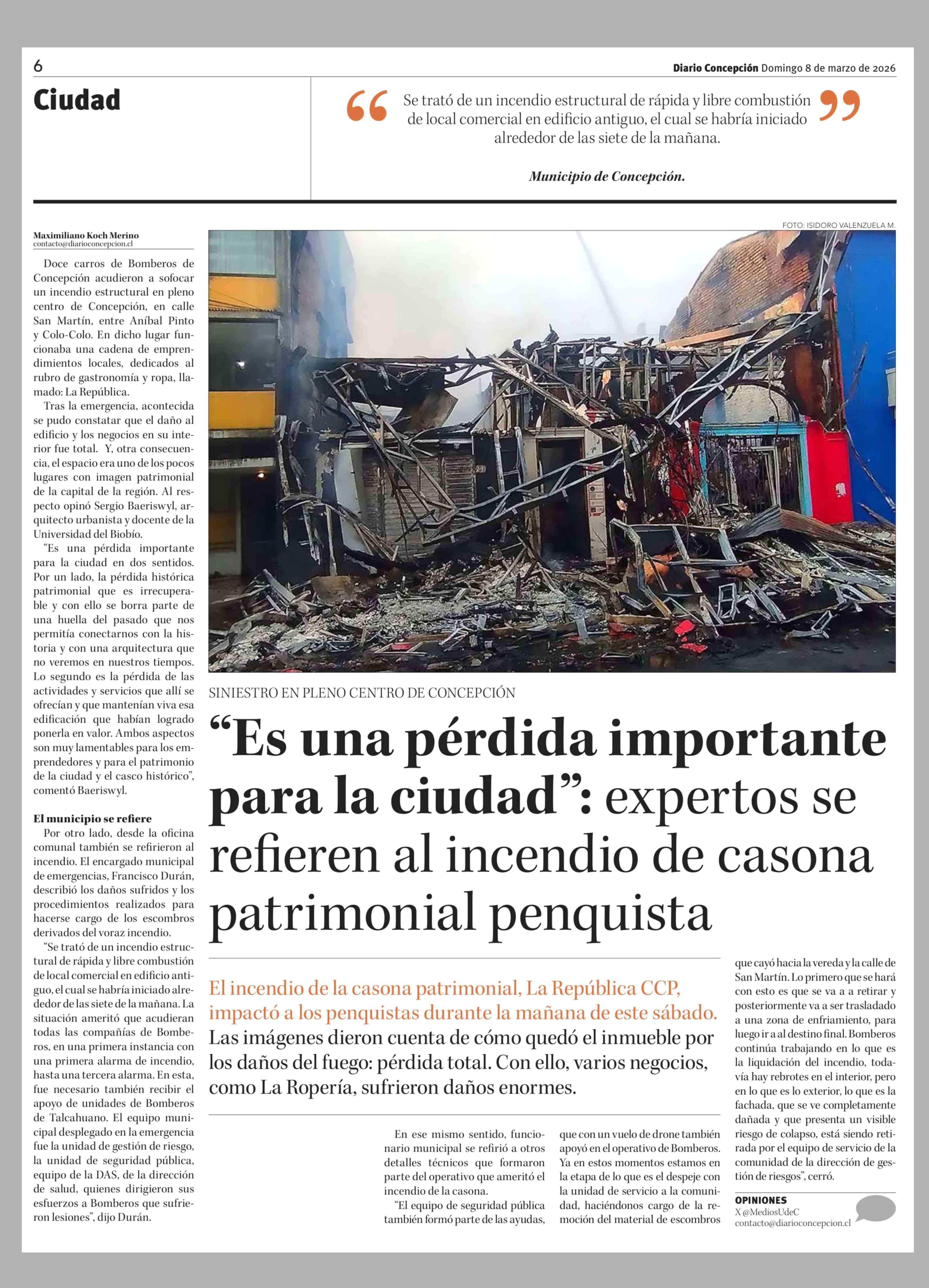 "Es una pérdida importante para la ciudad": expertos se refieren al incendio de casona patrimonial penquista 08-03-2026 Diario Concepción |