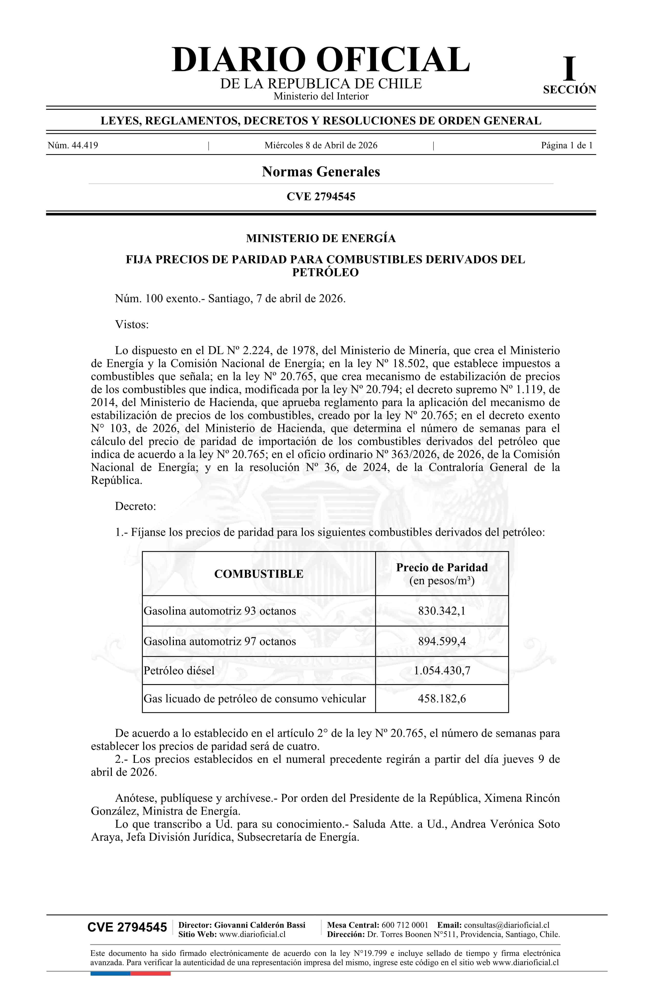 Decreto exento número 100, de 2026.- Fija precios de paridad para combustibles derivados del petróleo 08-04-2026 Diario Oficial Edición Electrónica |