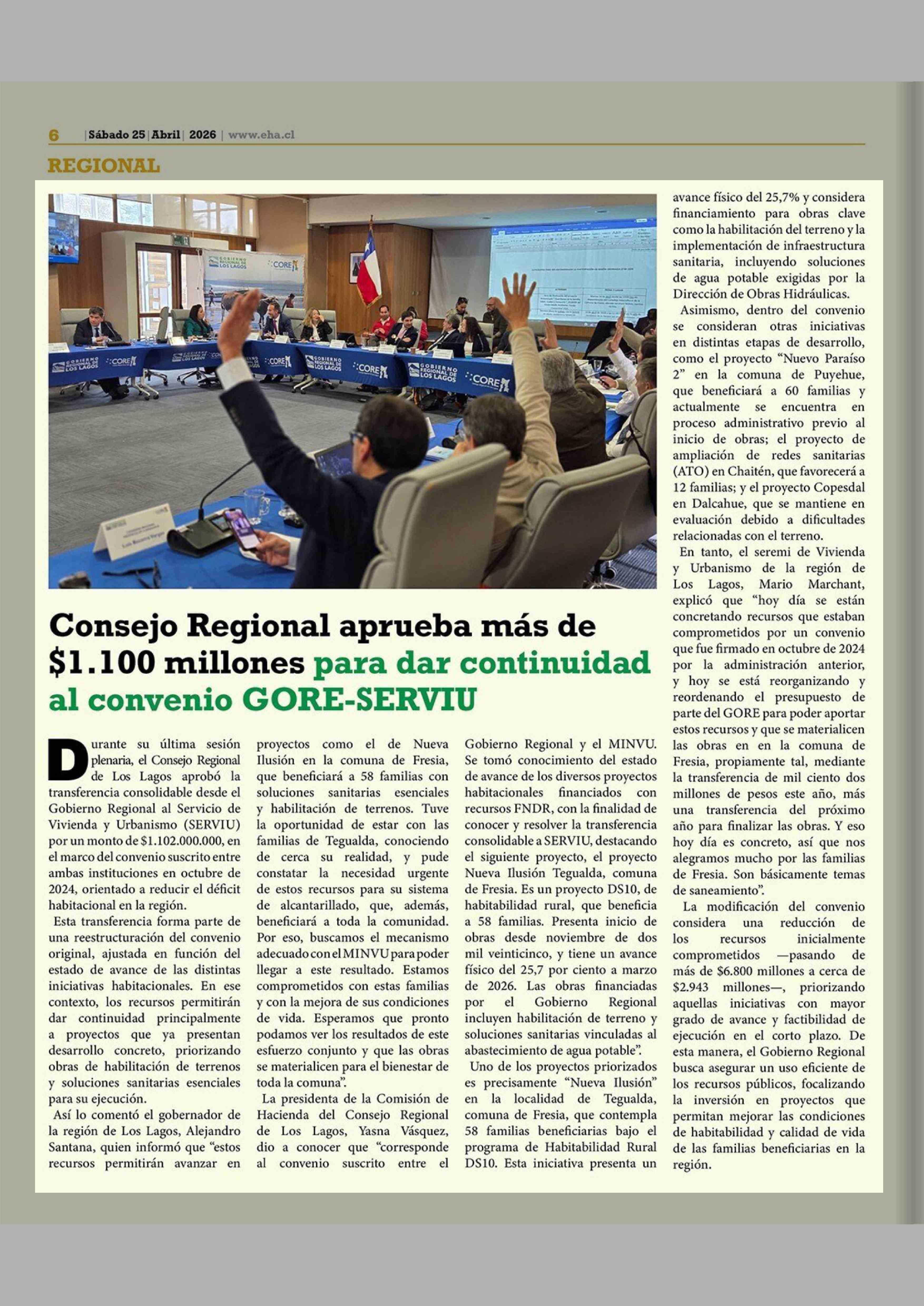 Consejo Regional aprueba más de $1.100 millones para dar continuidad al convenio GORE-SERVIU 25-04-2026 El Heraldo Austral |