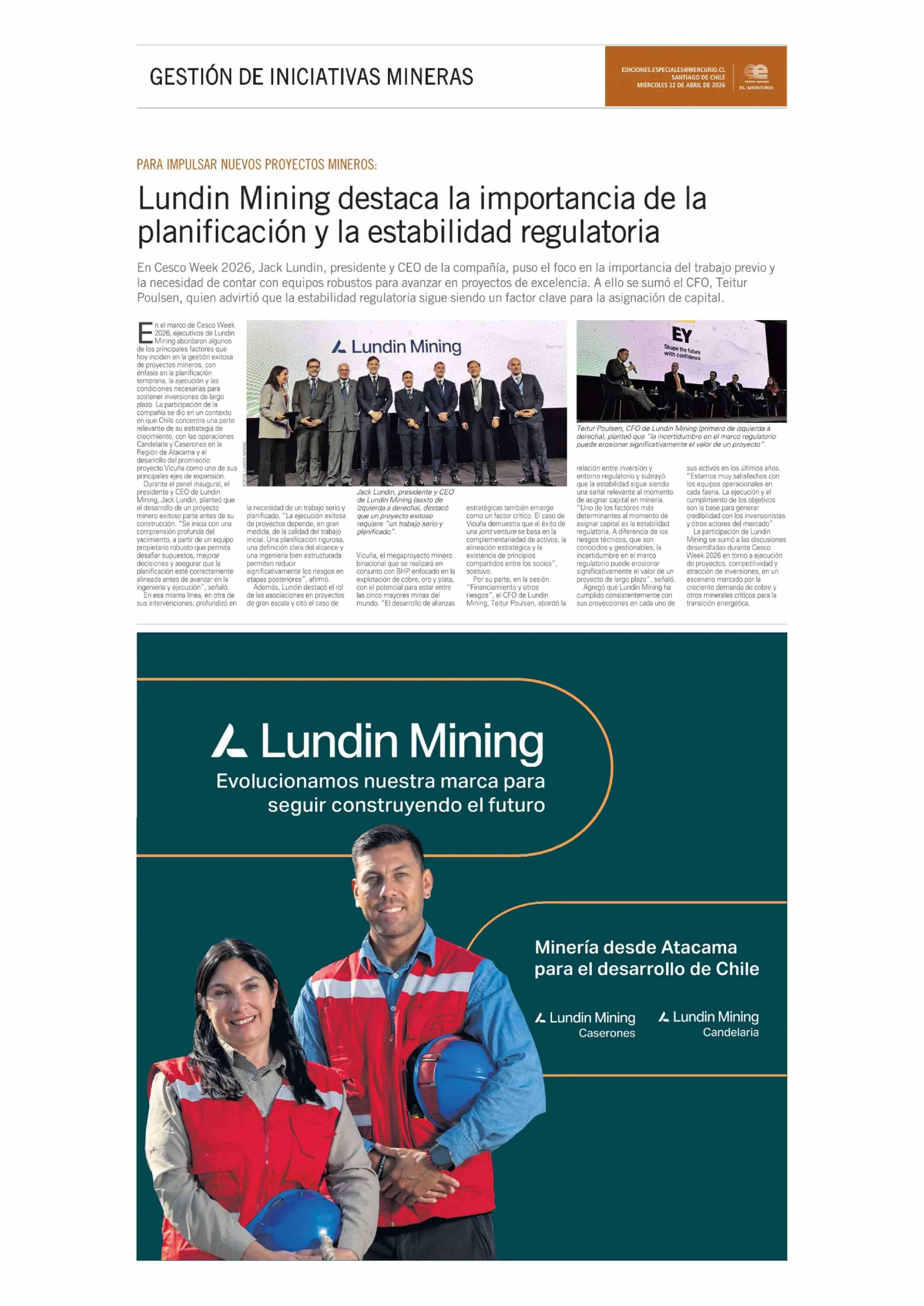 Lundin Mining destaca la importancia de la planificación y la estabilidad regulatoria 22-04-2026 El Mercurio |