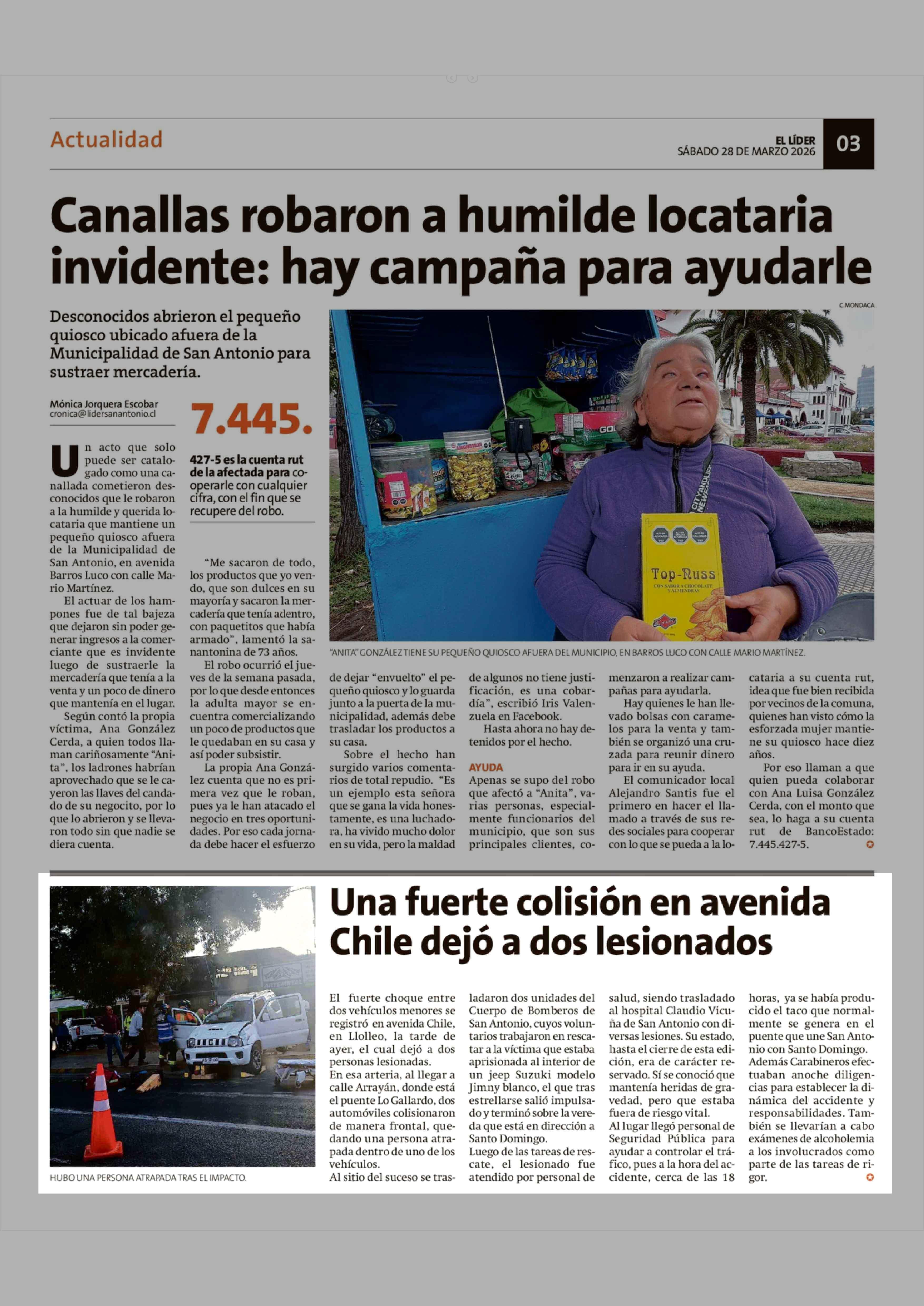 Una fuerte colisión en avenida Chile dejó a dos lesionados 28-03-2026 El Líder |
