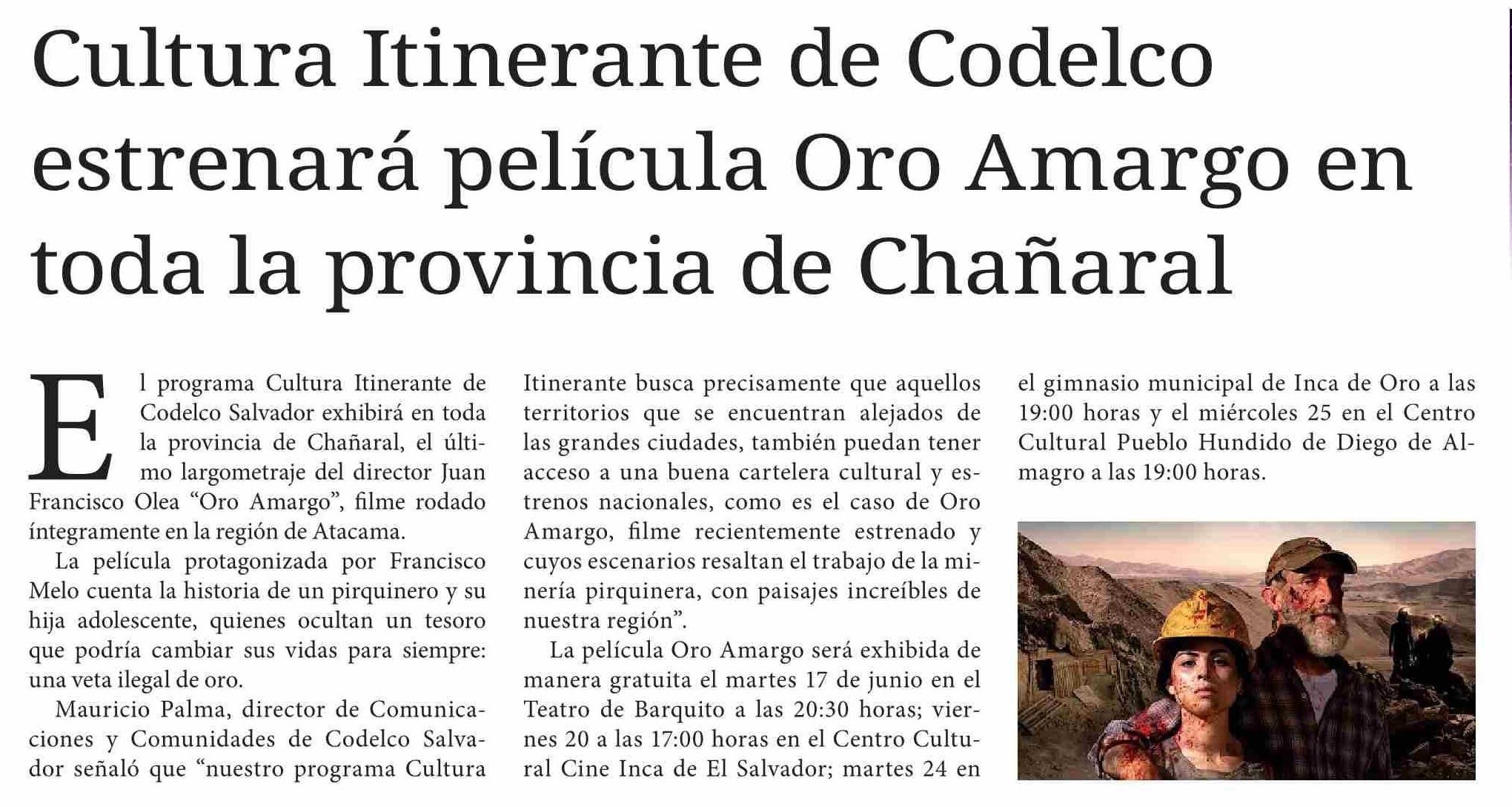 | Título: | Cultura Itinerante de Codelco estrenará película Oro Amargo en toda la provincia de Chañaral |