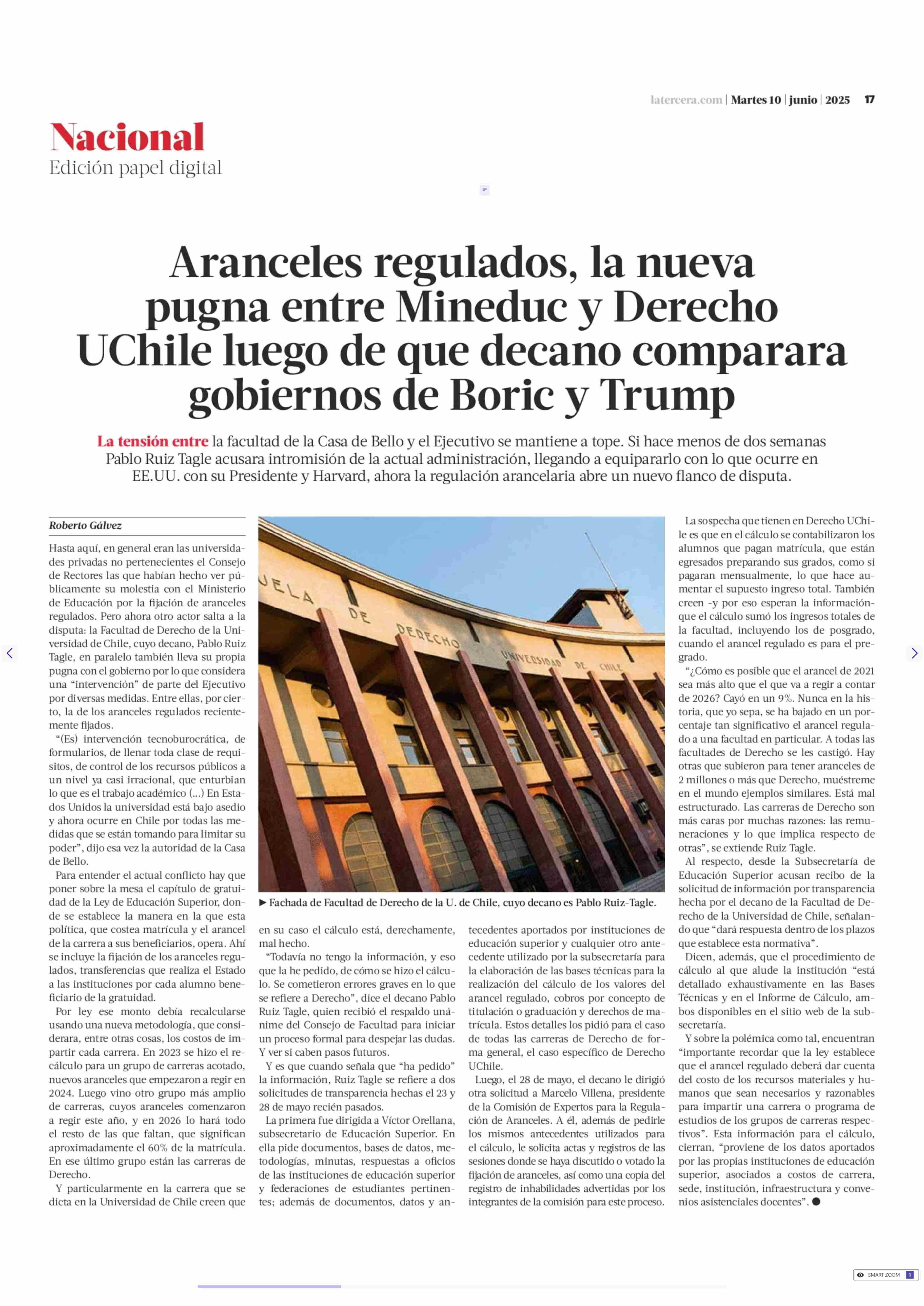 Aranceles regulados, la nueva pugna entre Mineduc y Derecho UChile luego de que decano comparara gobiernos de Boric y Trump 10-06-2025 La Tercera |