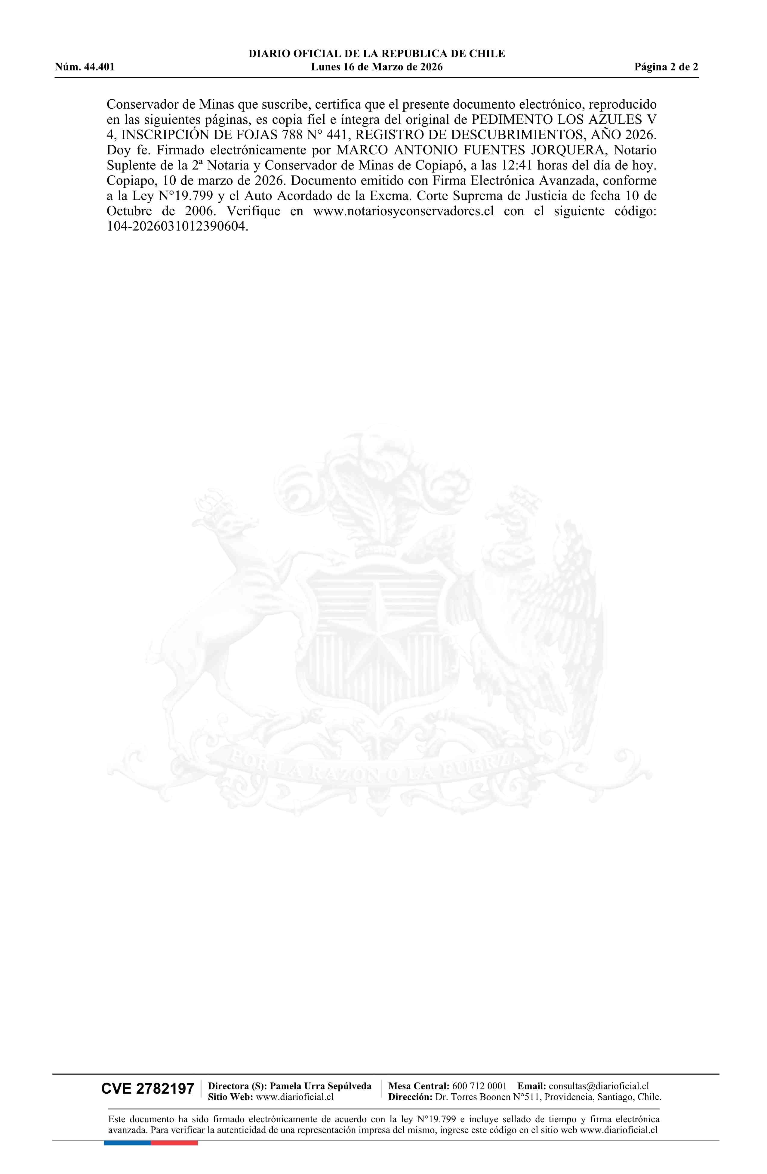 LOS AZULES V 4 / American Sierra Gold Chile SpA 16-03-2026 DIARIO OFICIAL CHILE - BOLETÍN OFICIAL DE MINERÍA |