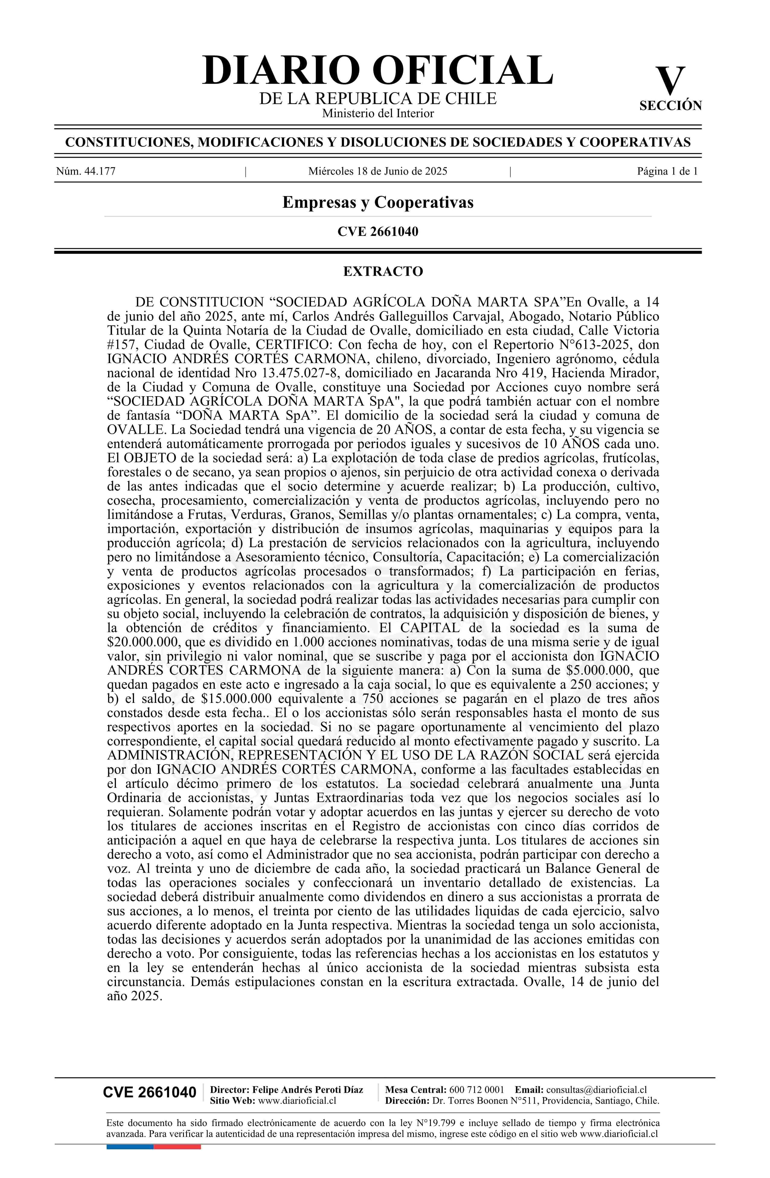 SOCIEDAD AGRÍCOLA DOÑA MARTA SpA 18-06-2025 Diario Oficial Edición Electrónica |