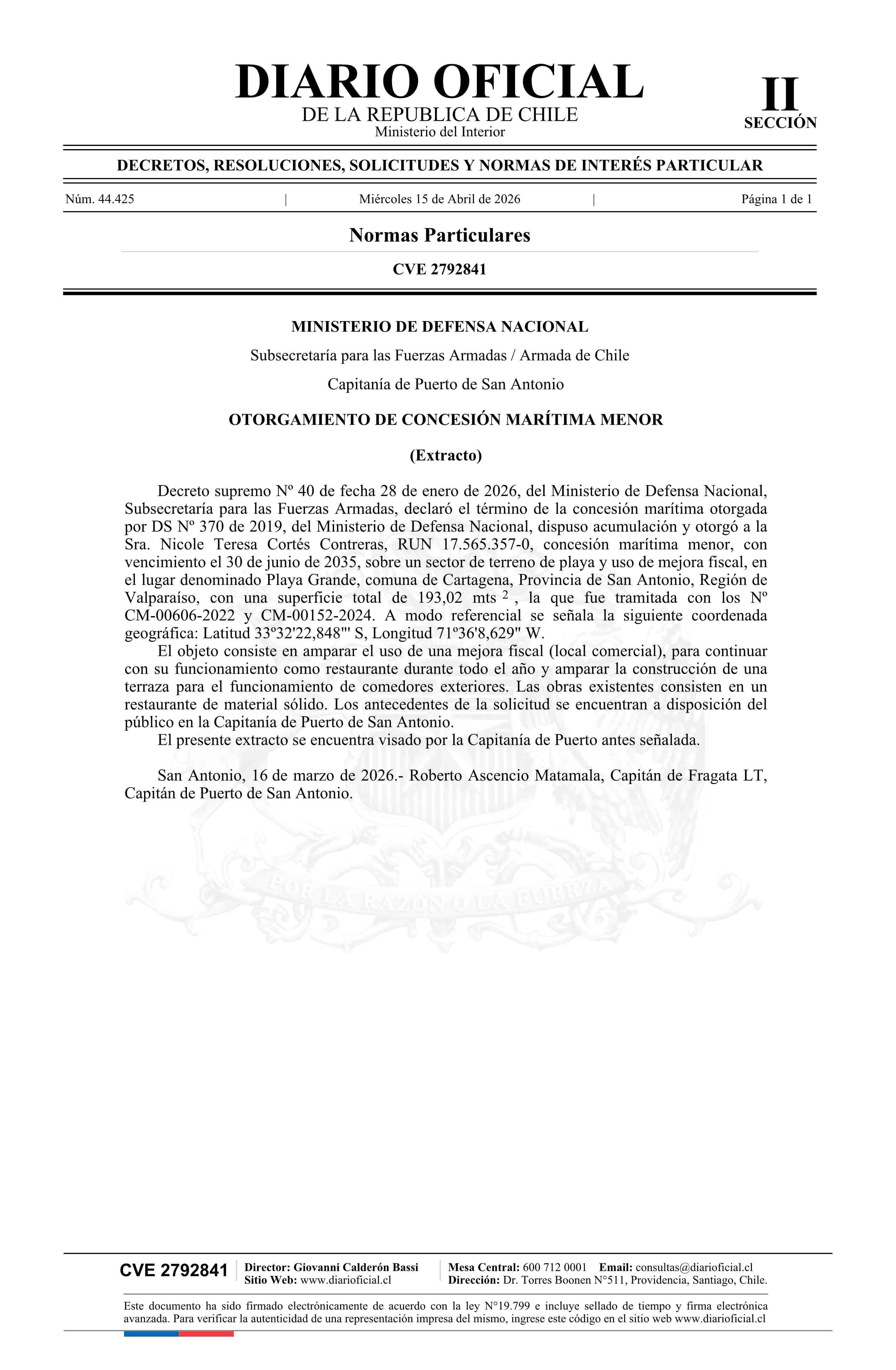 Extracto de decreto número 40, de 2026.- Otorgamiento de concesión marítima menor 15-04-2026 Diario Oficial Edición Electrónica |
