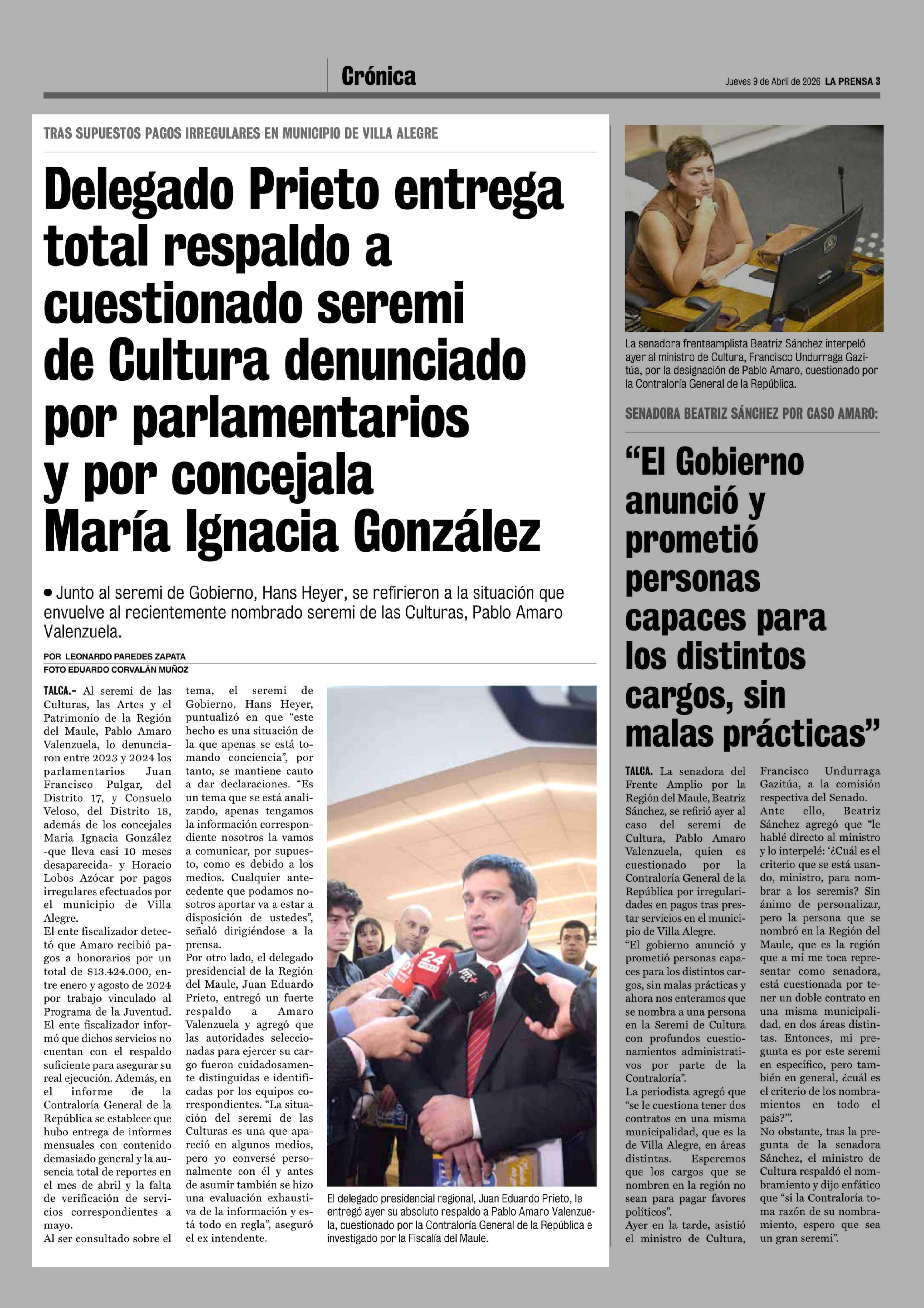 Delegado Prieto entrega total respaldo a cuestionado seremi de Cultura denunciado por parlamentarios y por concejala María Ignacia González 09-04-2026 La Prensa de Curicó |