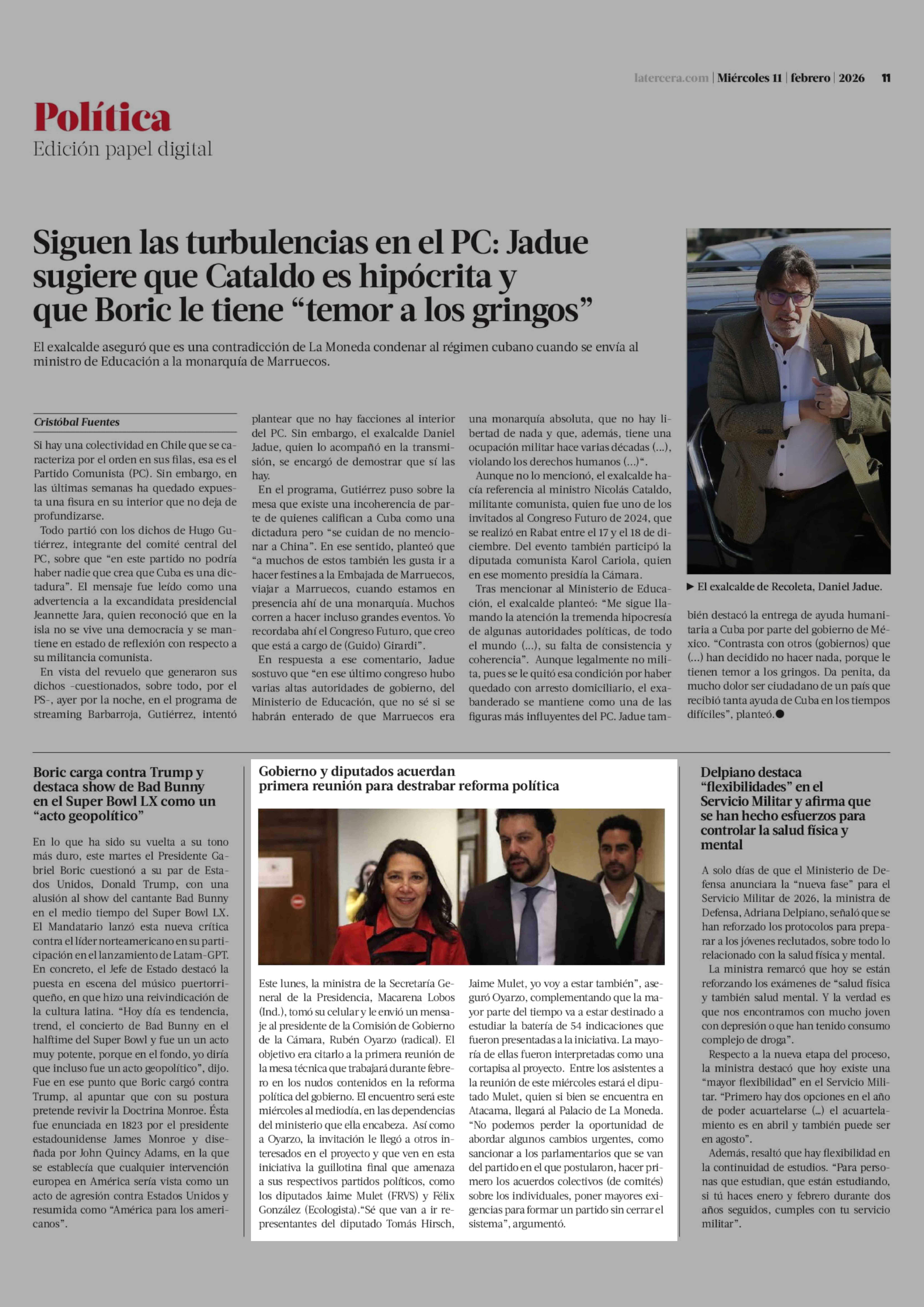 Gobierno y diputados acuerdan primera reunión para destrabar reforma política 11-02-2026 La Tercera |