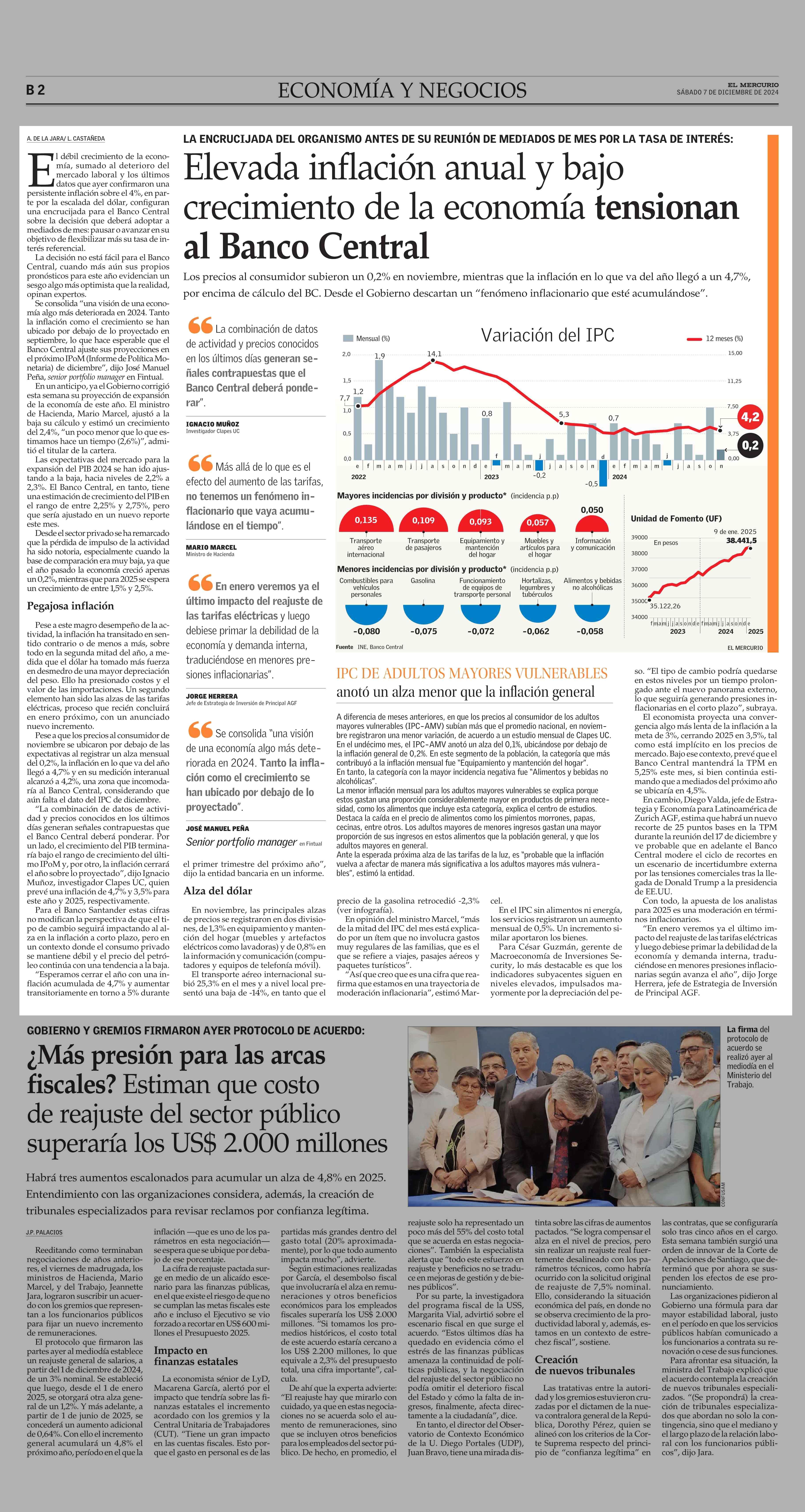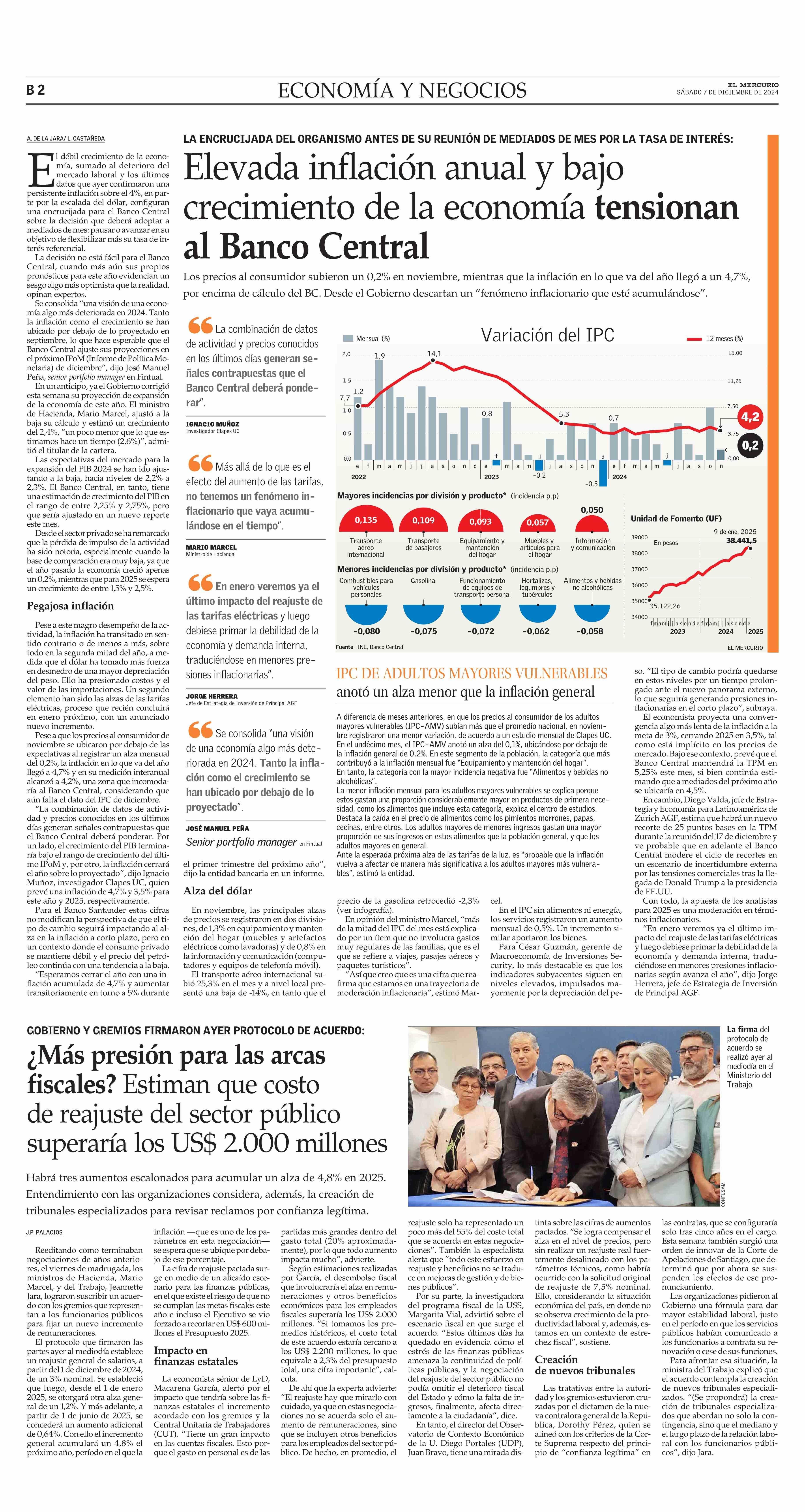 Elevada inflación anual y bajo crecimiento de la economía tensionan al Banco Central 07-12-2024 El Mercurio |