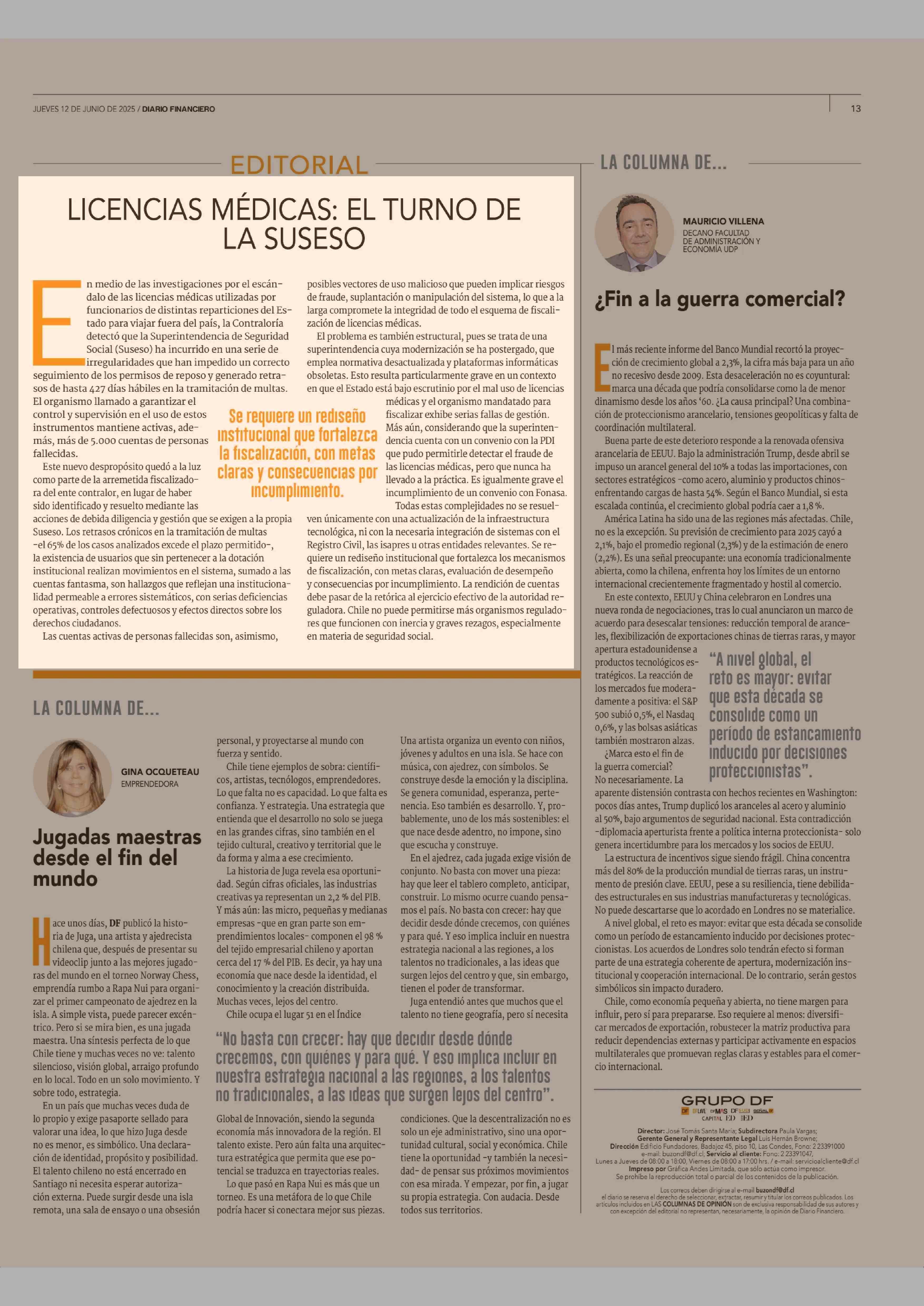 EDITORIAL: LICENCIAS MÉDICAS: EL TURNO DE LA SUSESO 12-06-2025 Diario Financiero |