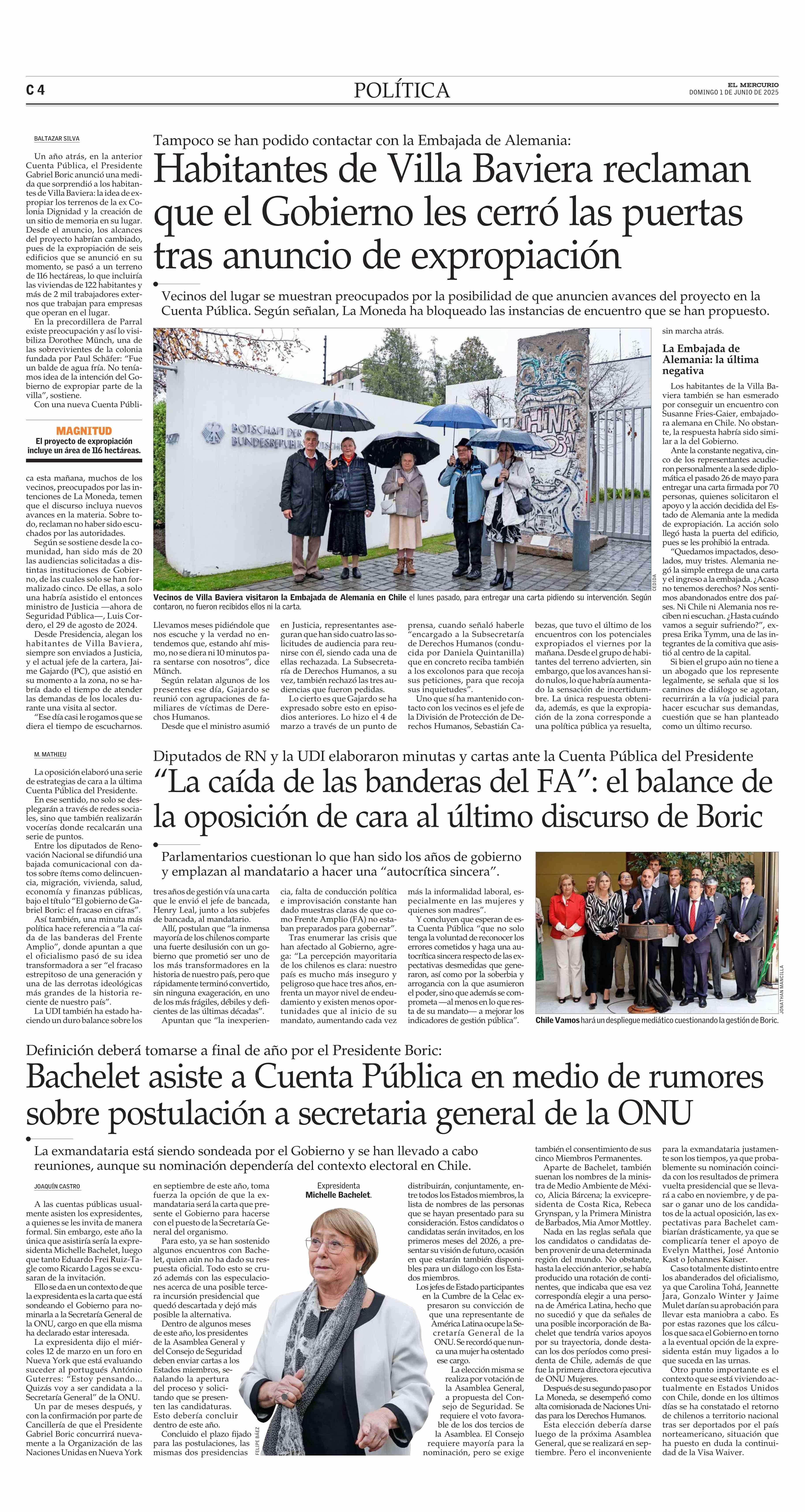 Bachelet asiste a Cuenta Pública en medio de rumores sobre postulación a secretaria general de la ONU 01-06-2025 El Mercurio |
