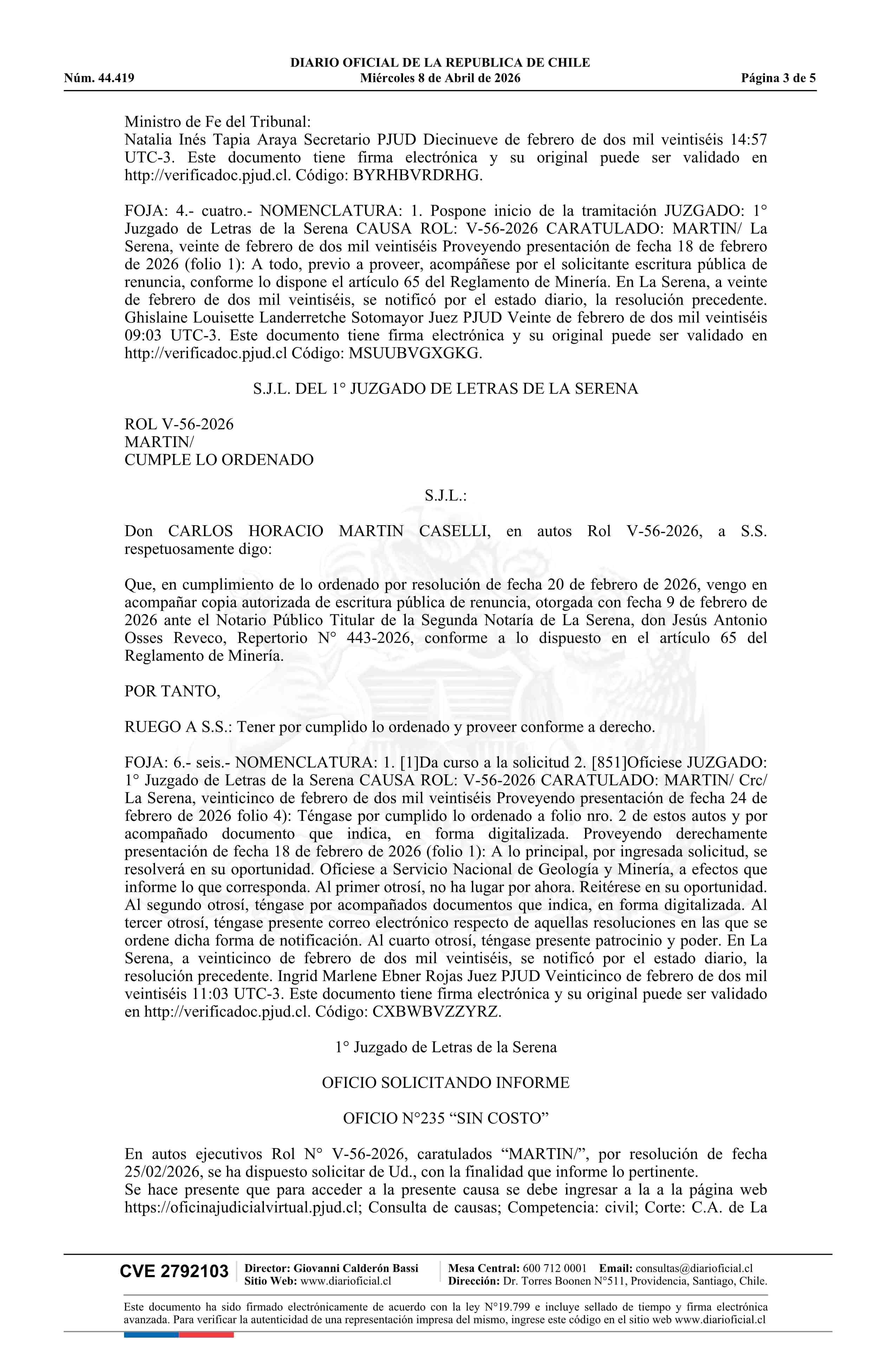 | Fuente: | DIARIO OFICIAL CHILE - BOLETÍN OFICIAL DE MINERÍA (DIARIO OFICIAL CHILE – BOM – RENUNCIAS CONCESIÓN) | Página(s): | 1-5 |