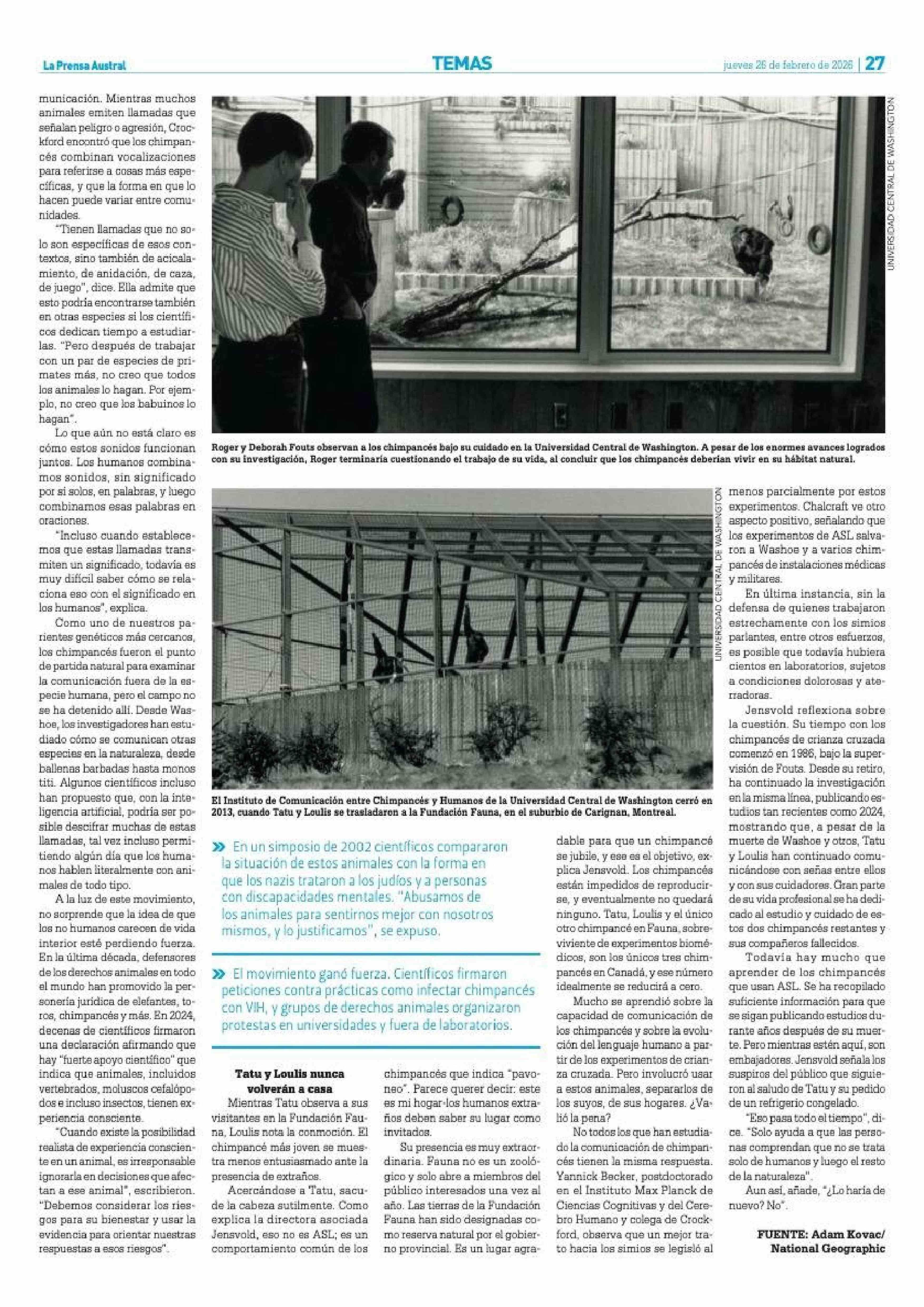 Conoce a Tatu y Loulis, los últimos chimpancés "parlantes" 26-02-2026 La Prensa Austral |