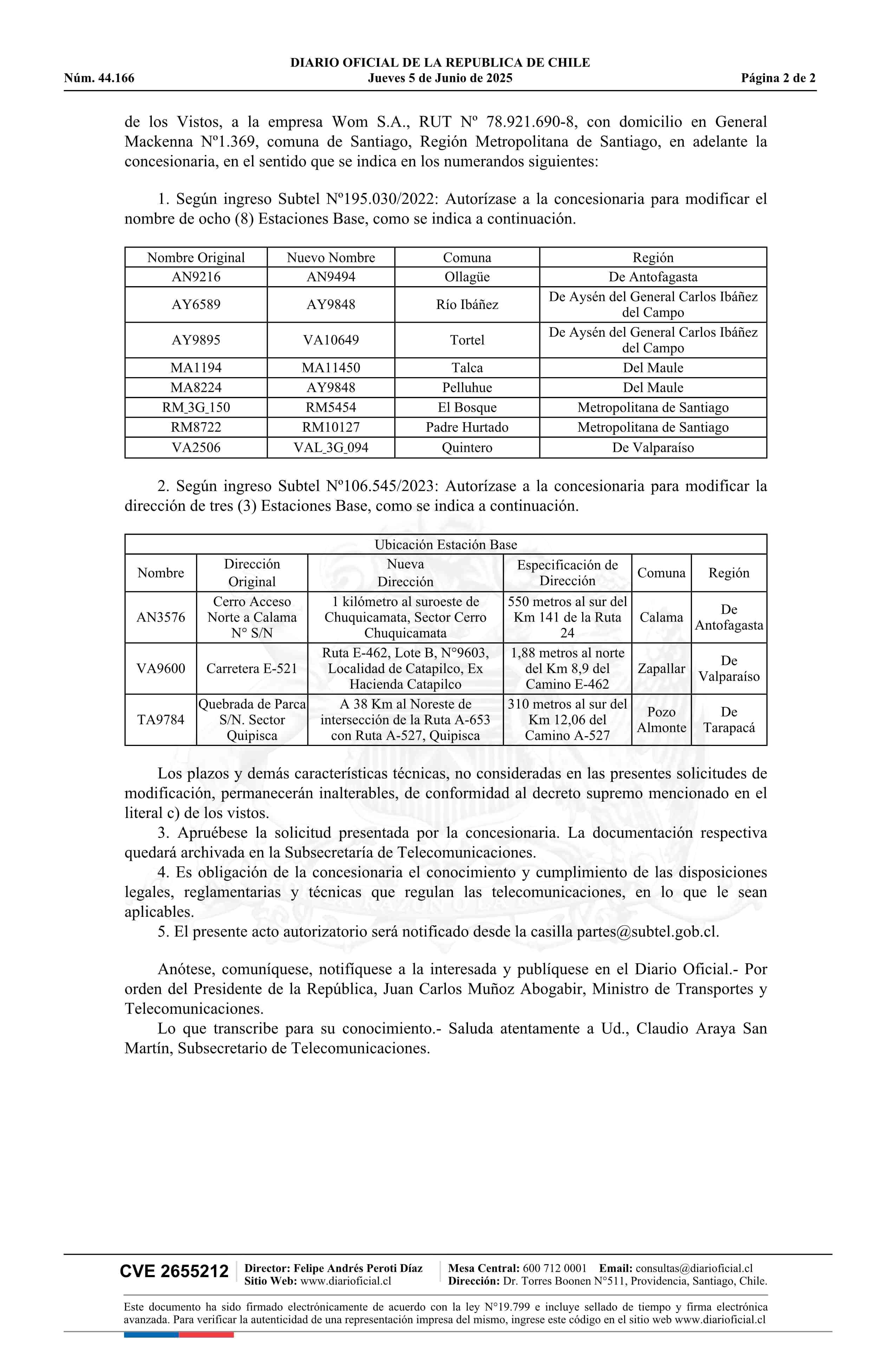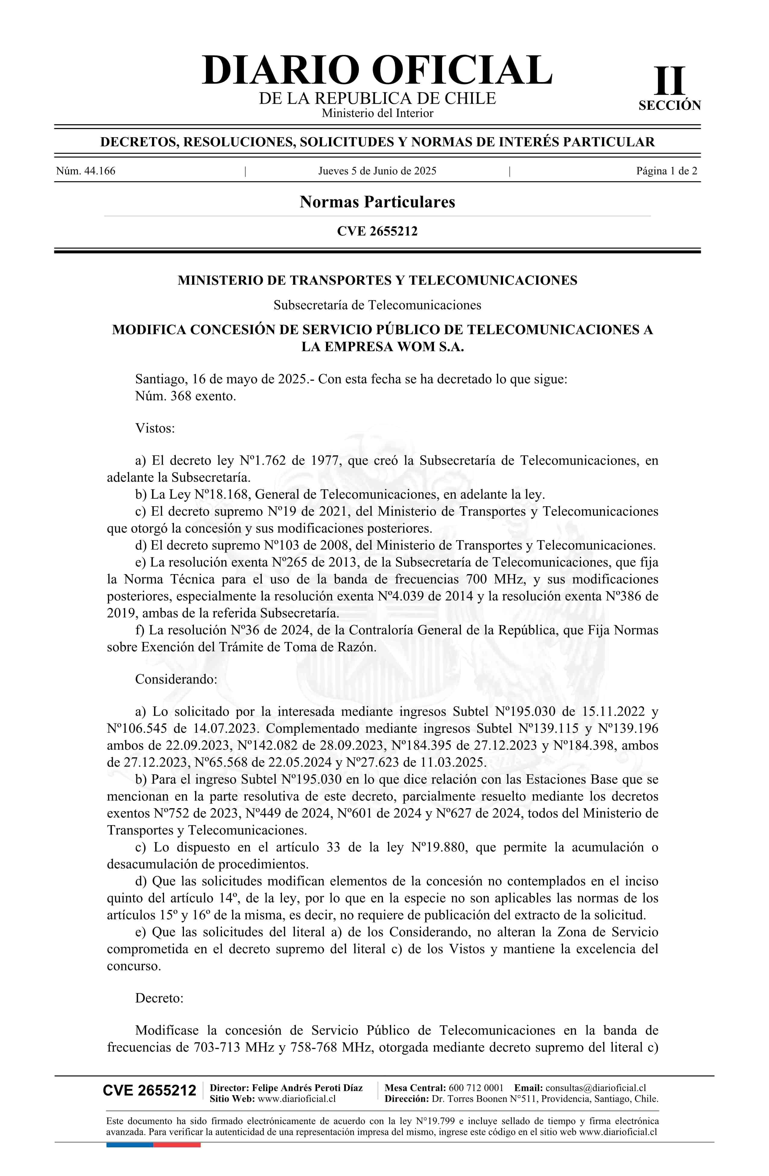 Decreto exento número 368, de 2025.- Modifica concesión de servicio público de telecomunicaciones a la empresa Wom S.A.