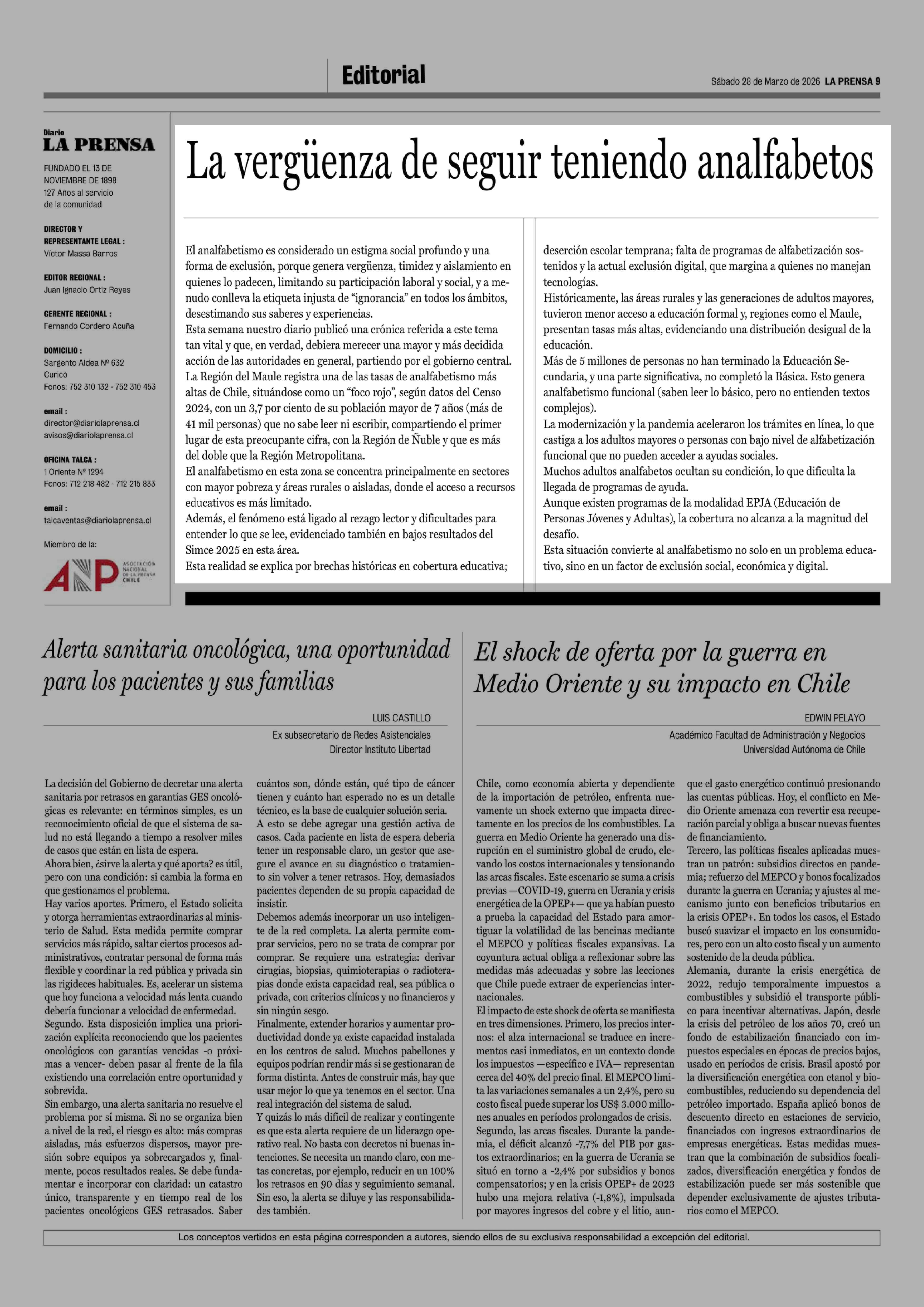 Editorial: La vergüenza de seguir teniendo analfabetos 28-03-2026 La Prensa de Curicó |