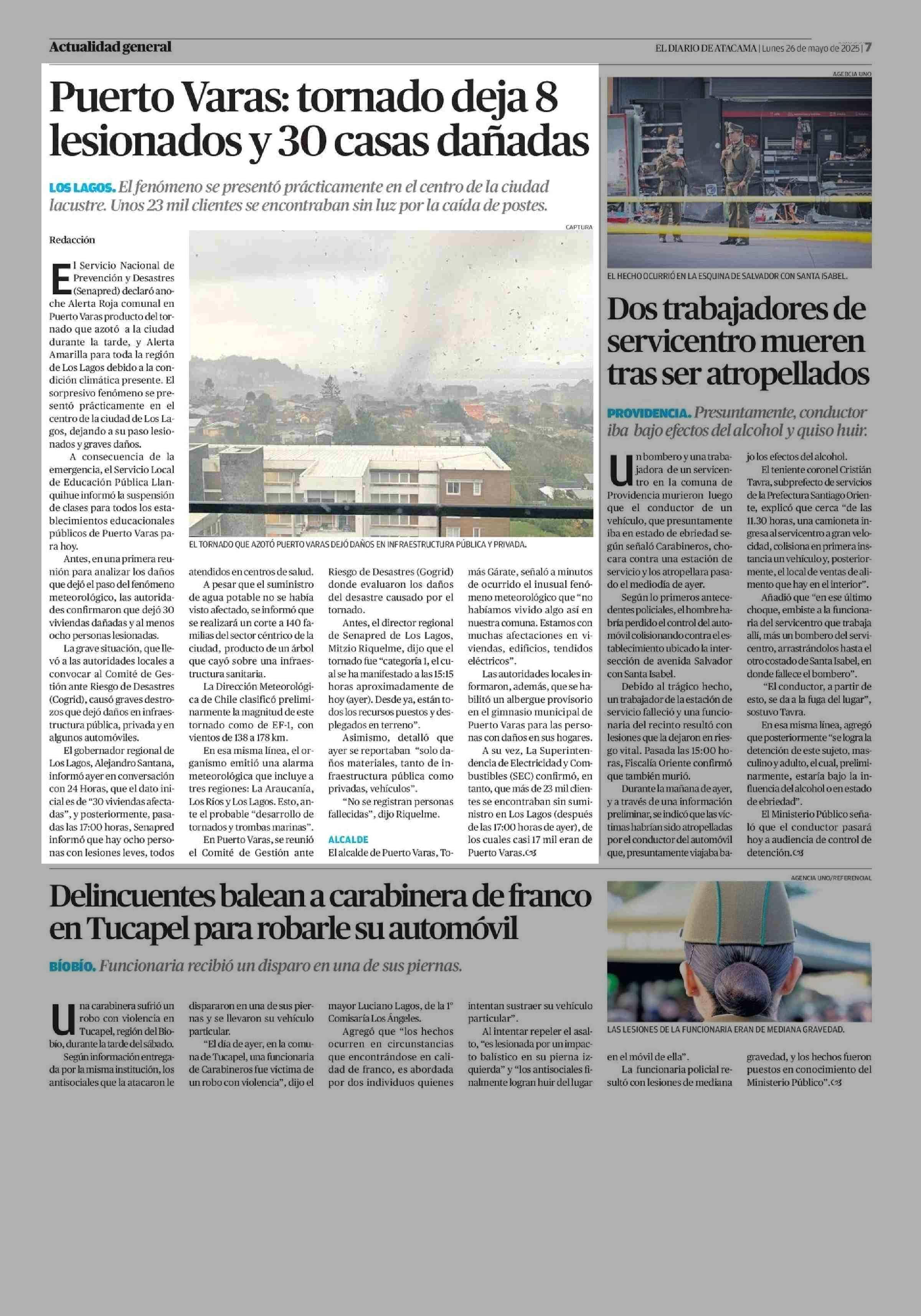 Puerto Varas: tornado deja 8 lesionados y 30 casas dañadas 26-05-2025 El Diario de Atacama |
