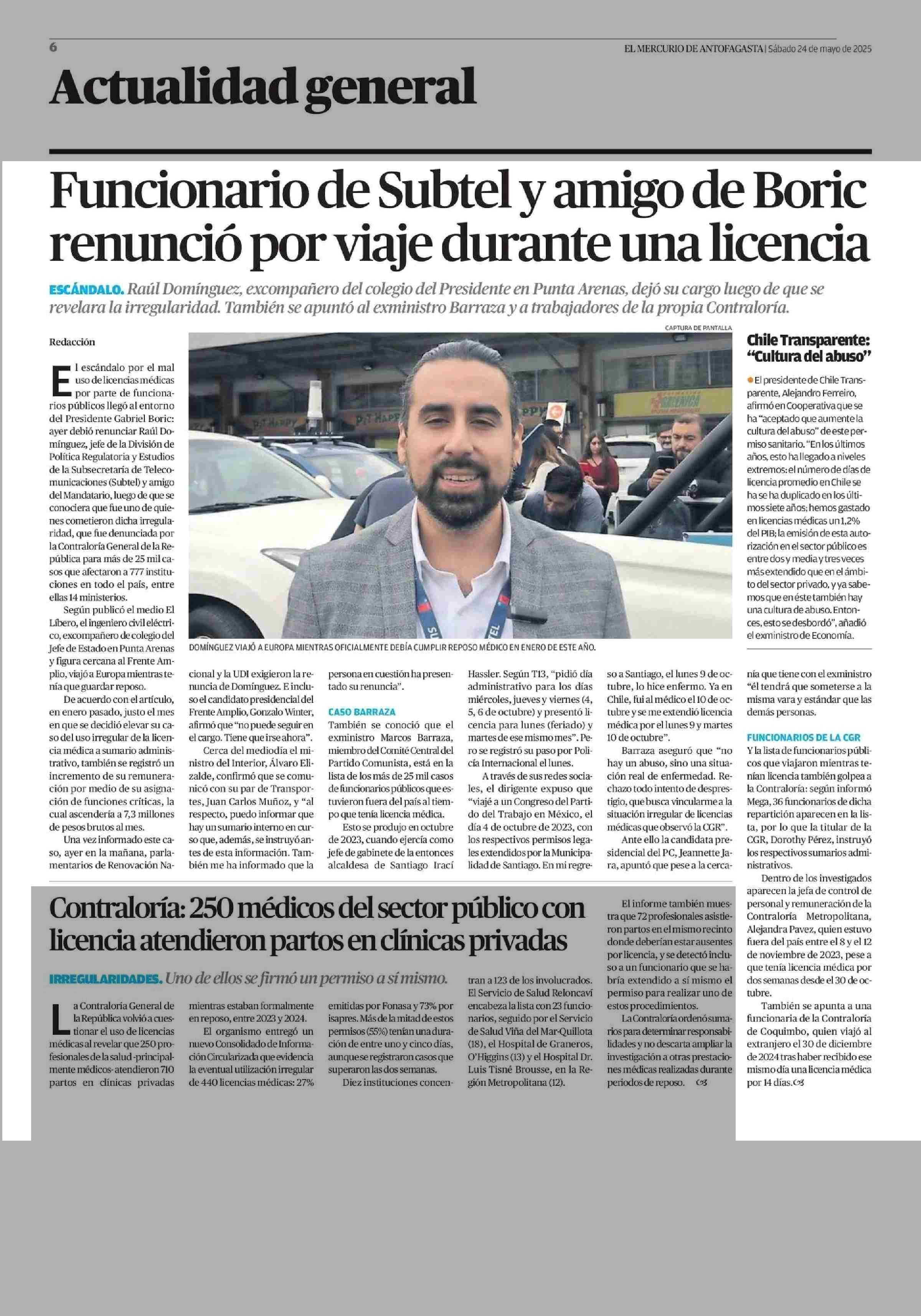 Funcionario de Subtel y amigo de Boric renunció por viaje durante una licencia 24-05-2025 El Mercurio de Antofagasta |