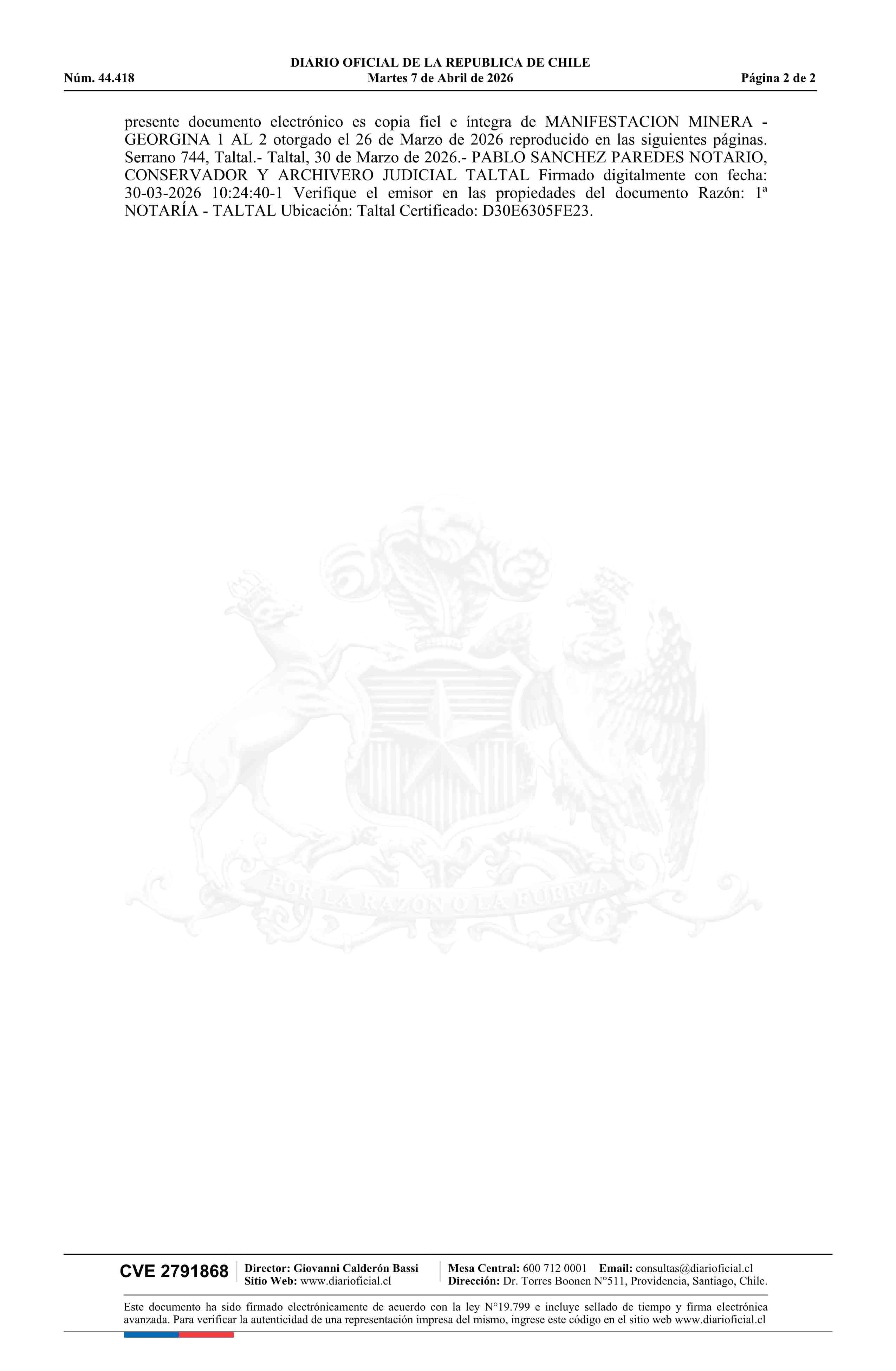 Fuente: DIARIO OFICIAL CHILE - BOLETÍN OFICIAL DE MINERÍA (DIARIO OFICIAL CHILE – BOM – MANIFESTACIONES MIN) Página(s): 2-3