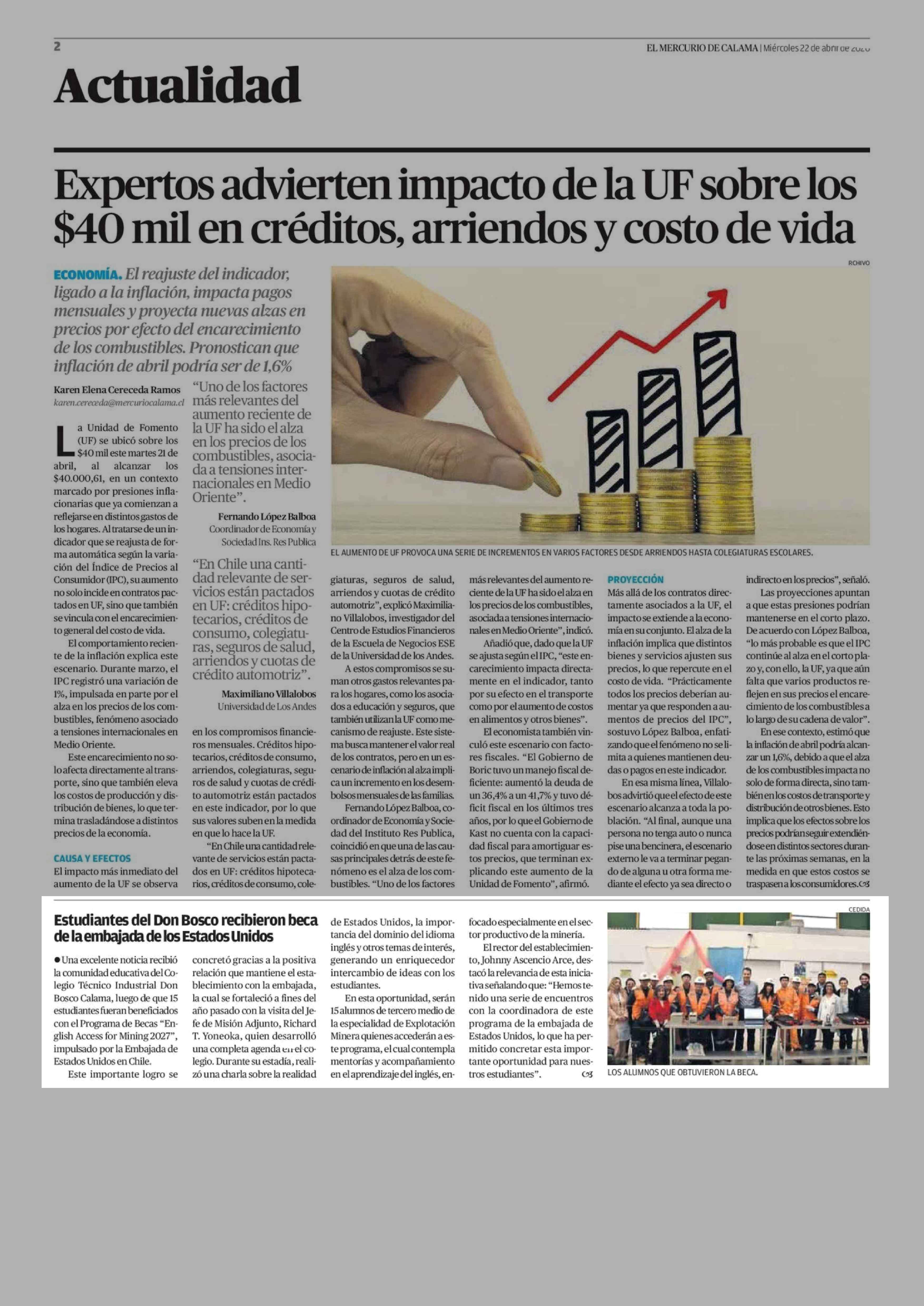 Estudiantes del Don Bosco recibieron beca de la embajada de los Estados Unidos 22-04-2026 El Mercurio de Calama |