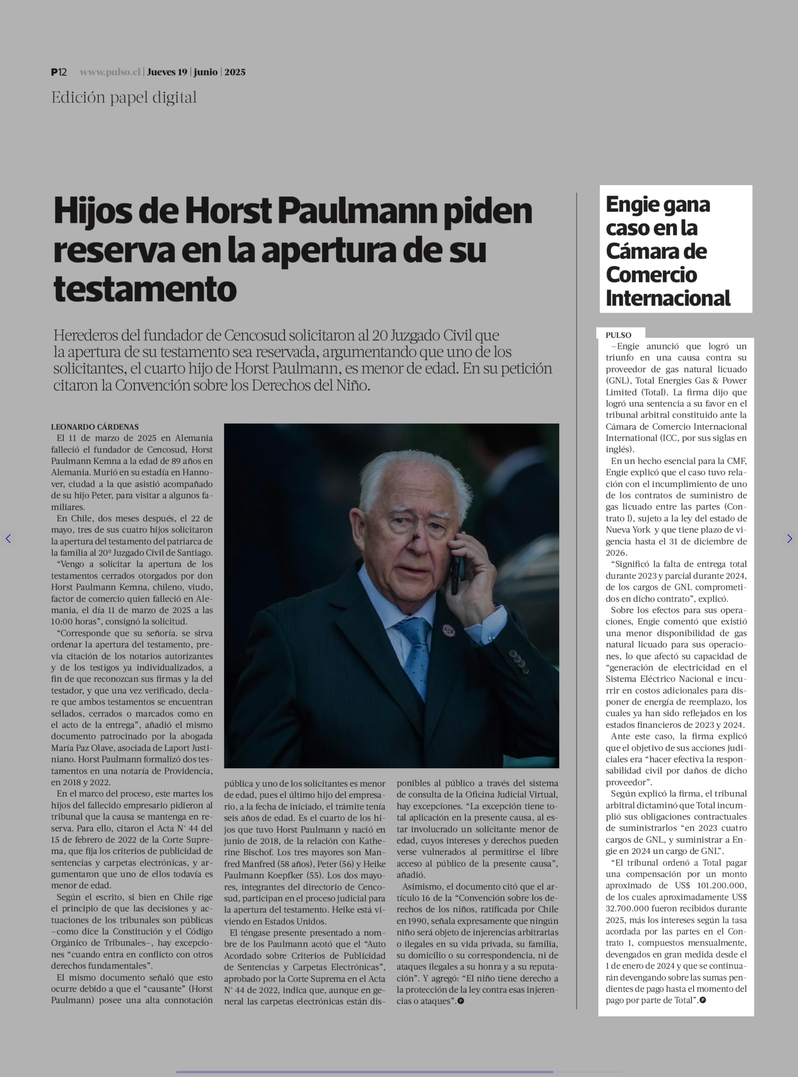 Engie gana caso en la Cámara de Comercio Internacional 19-06-2025 La Tercera |