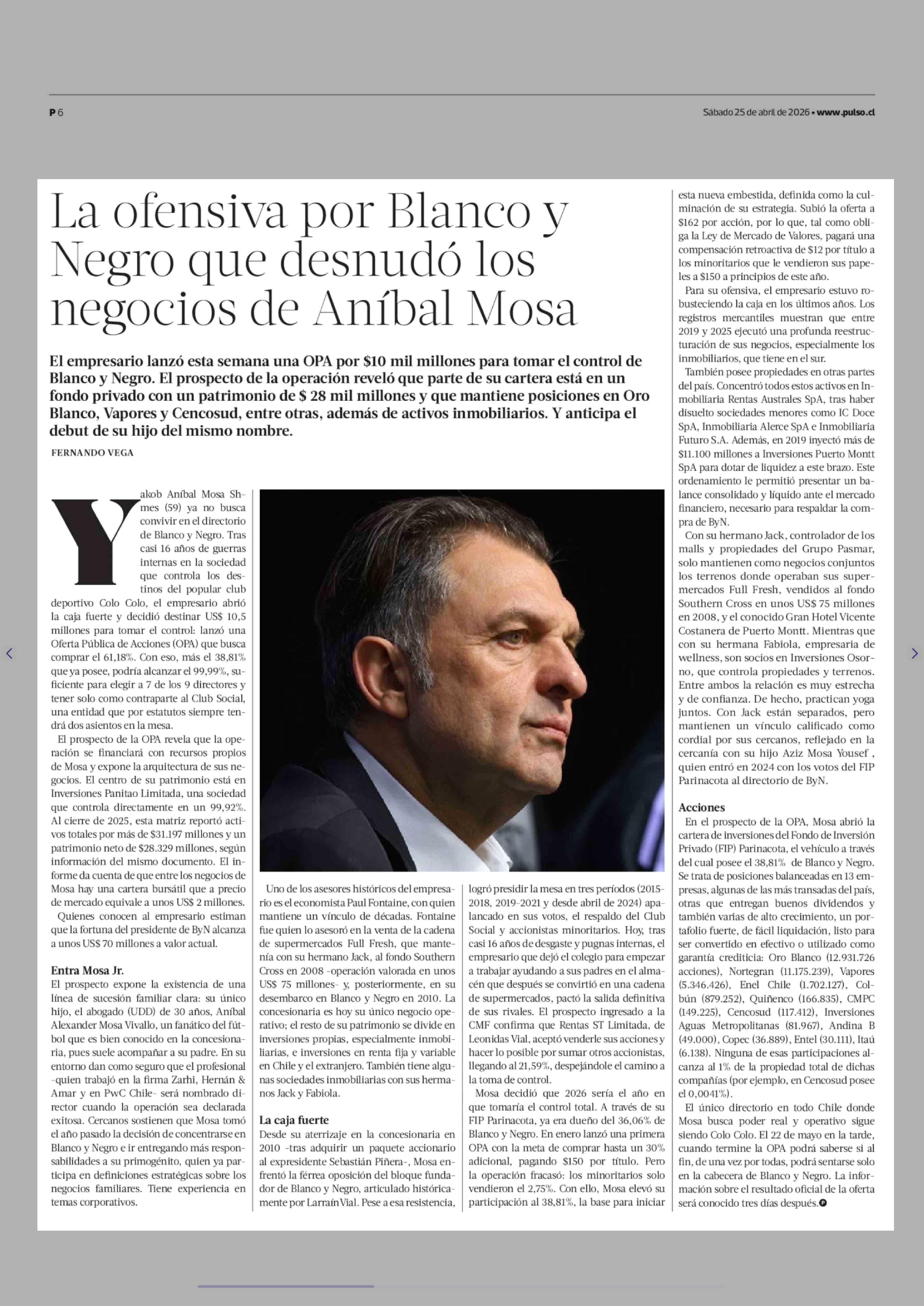 La ofensiva por Blanco y Negro que desnudó los negocios de Aníbal Mosa 25-04-2026 La Tercera |