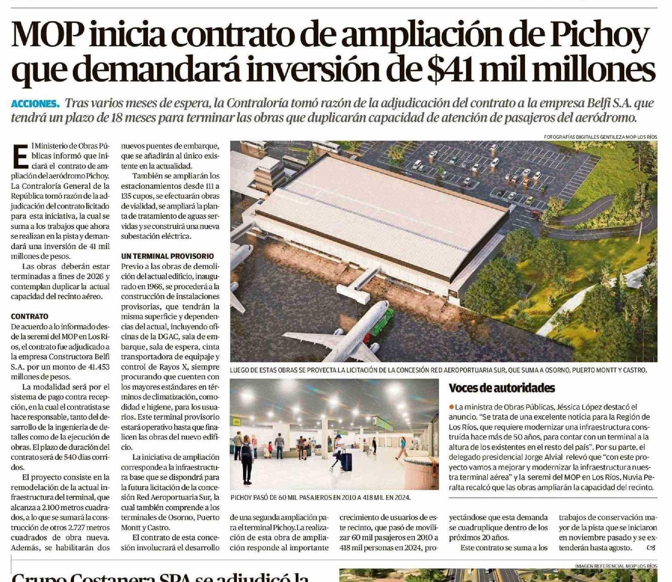 MOP inicia contrato de ampliación de Pichoy que demandará inversión de $41 mil millones 09-03-2025 Diario Austral Región de Los Ríos |