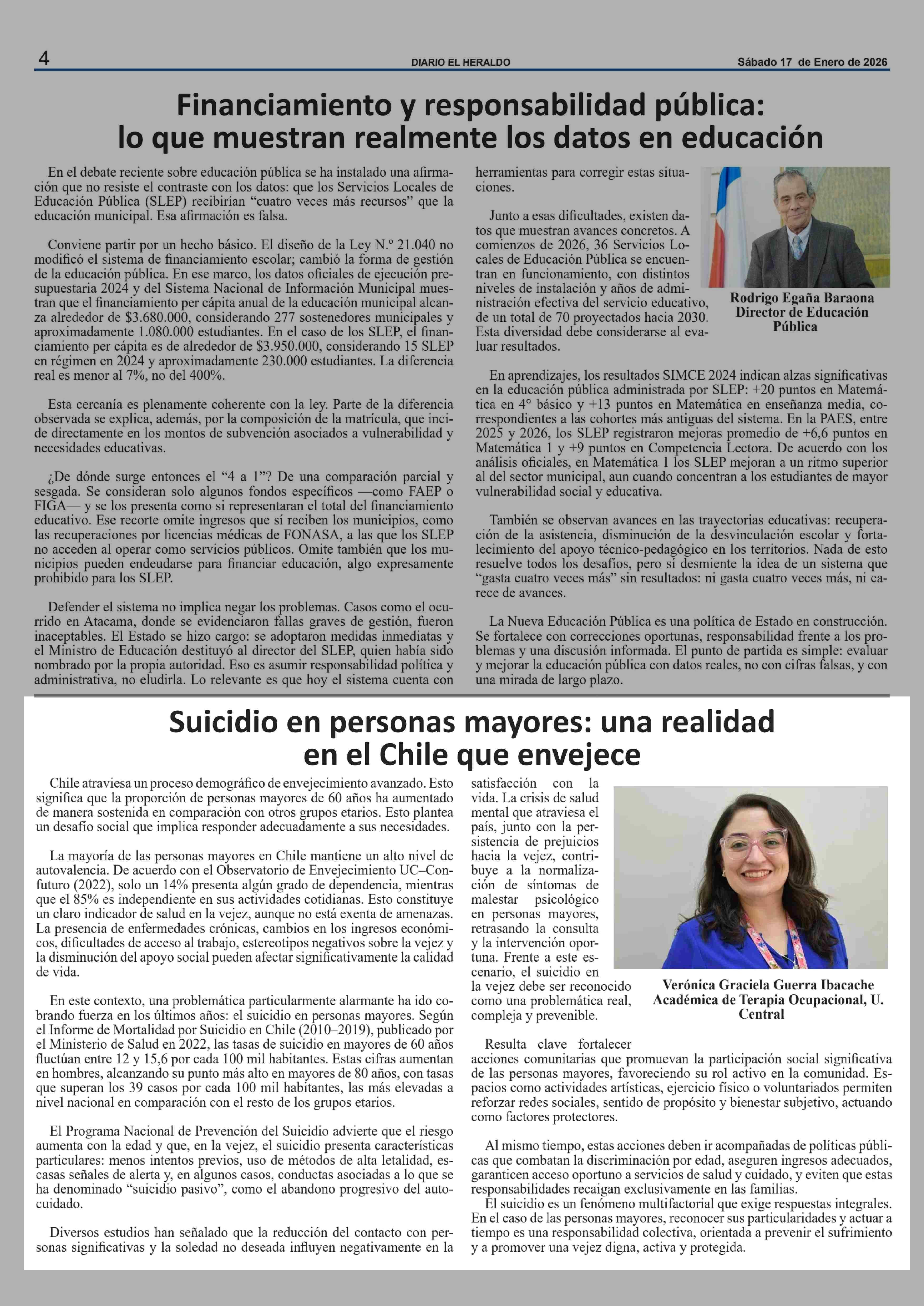 Columnas de Opinión: Suicidio en personas mayores: una realidad en el Chile que envejece 17-01-2026 El Heraldo |
