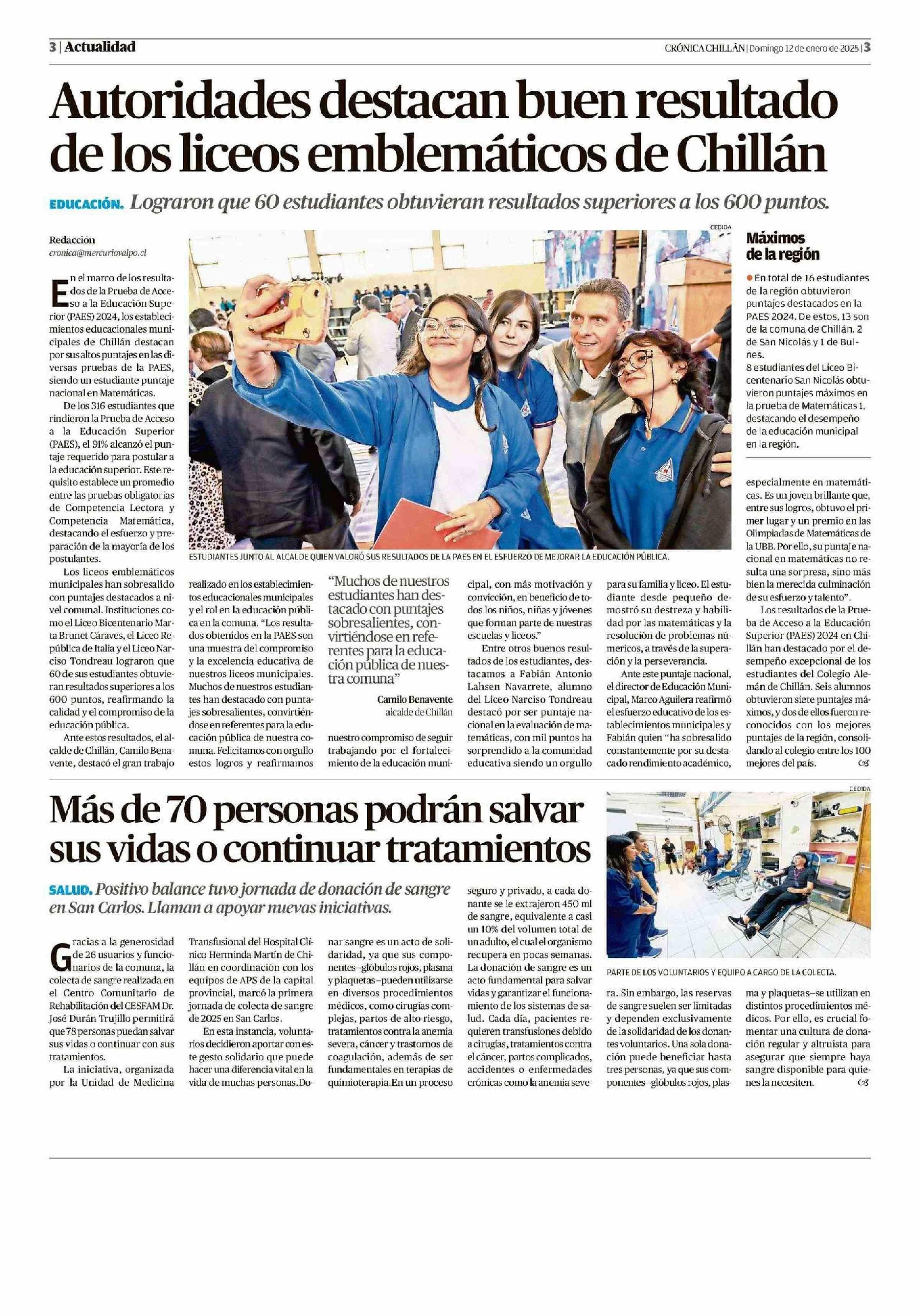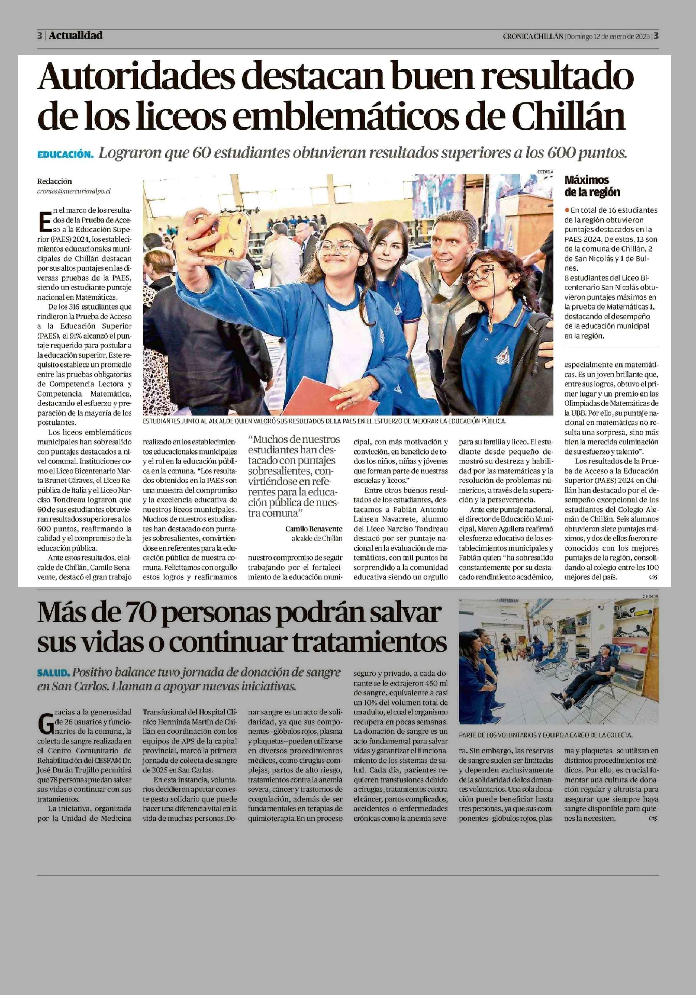 Autoridades destacan buen resultado de los liceos emblemáticos de Chillán 12-01-2025 Crónica de Chillán |