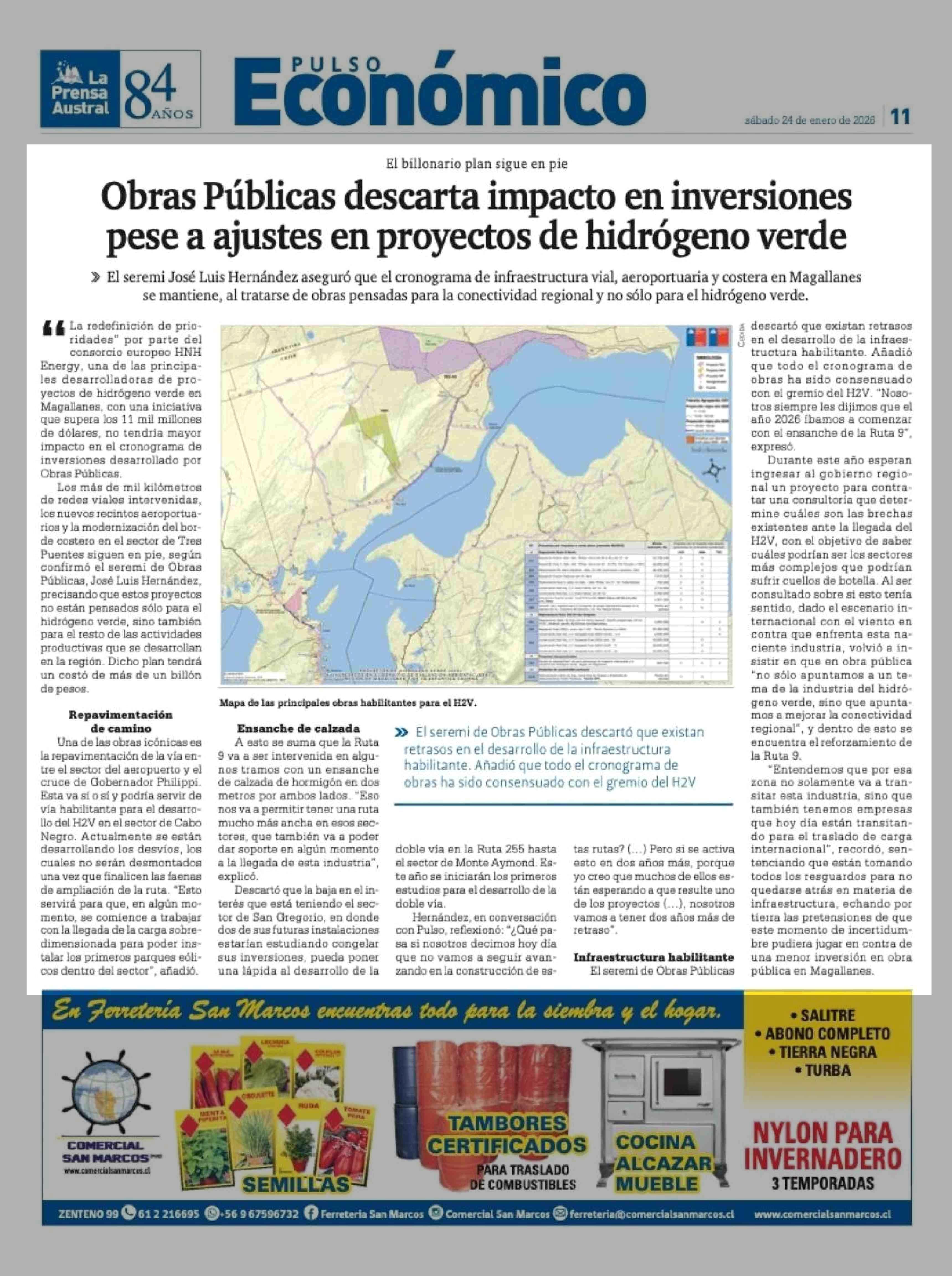 Obras Públicas descarta impacto en inversiones pese a ajustes en proyectos de hidrógeno verde 24-01-2026 La Prensa Austral |