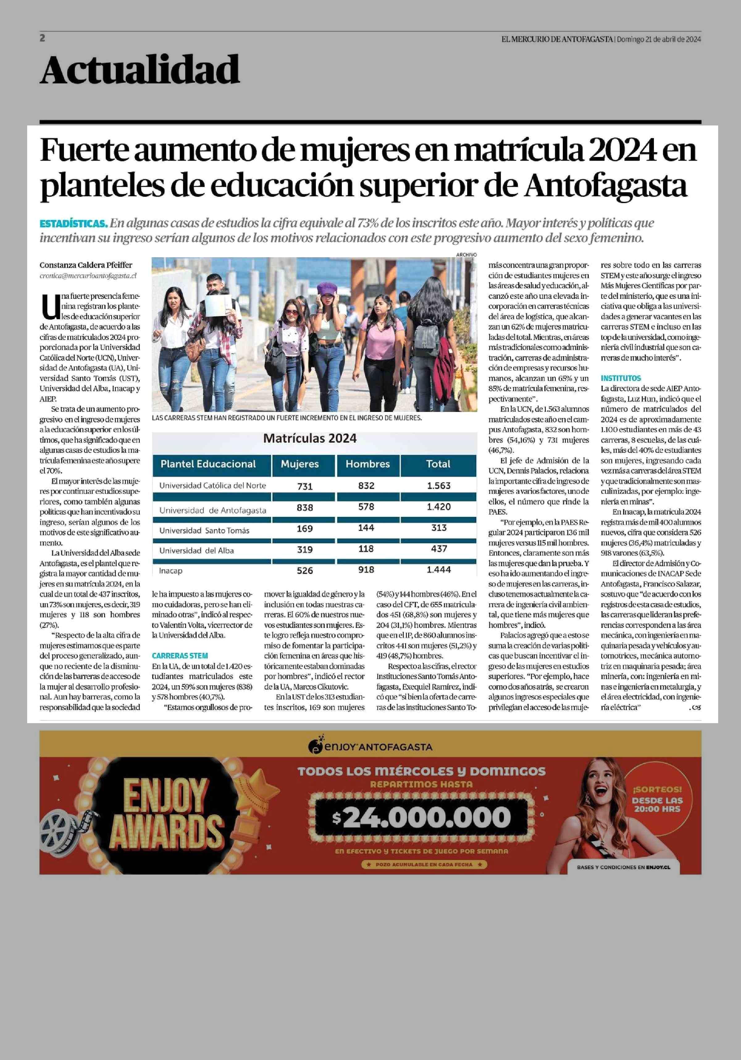Fuerte aumento de mujeres en matrícula 2024 en planteles de educación superior de Antofagasta 21-04-2024 El Mercurio de Antofagasta |